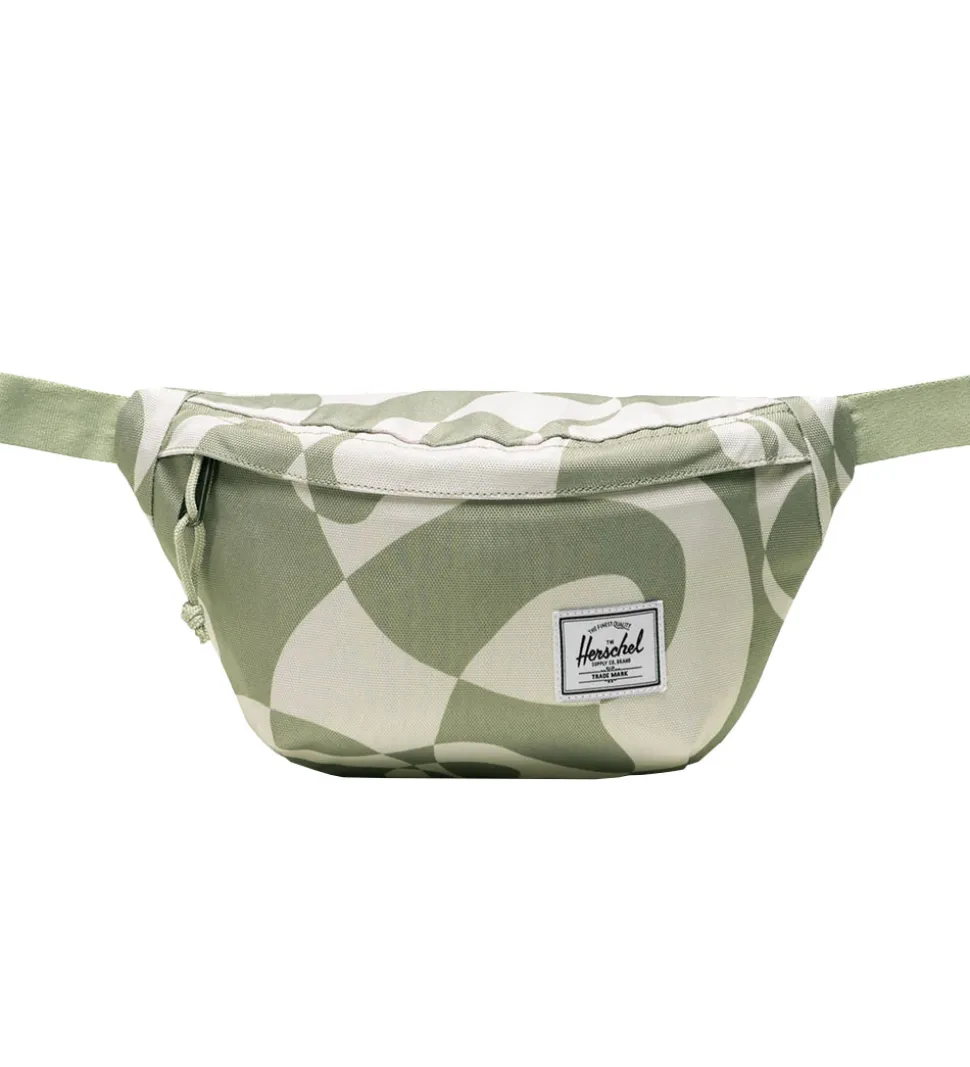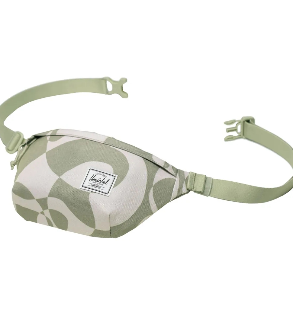 Smart Herschel bæltetaske med et abstrakt mønster i lysegrøn og hvid. Den har en praktisk størrelse og et klassisk Herschel logopatch på fronten, som tilføjer et moderne touch.