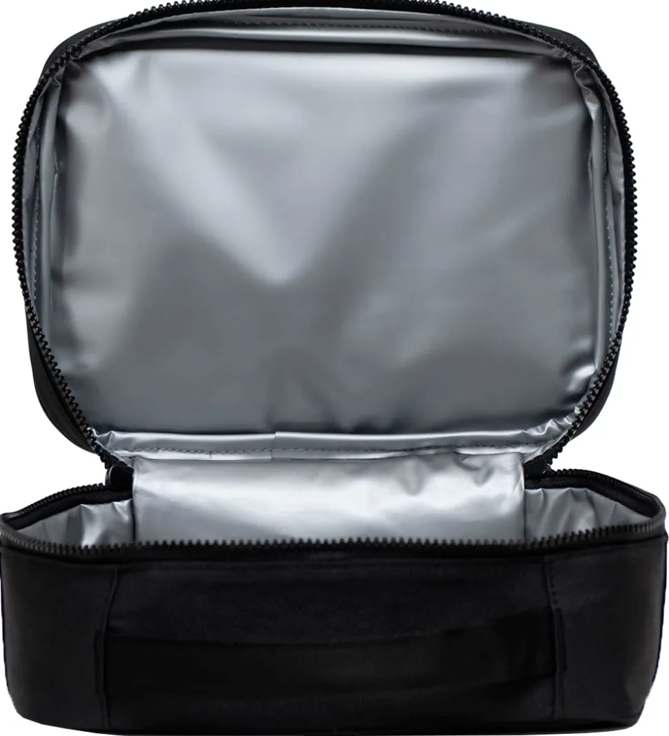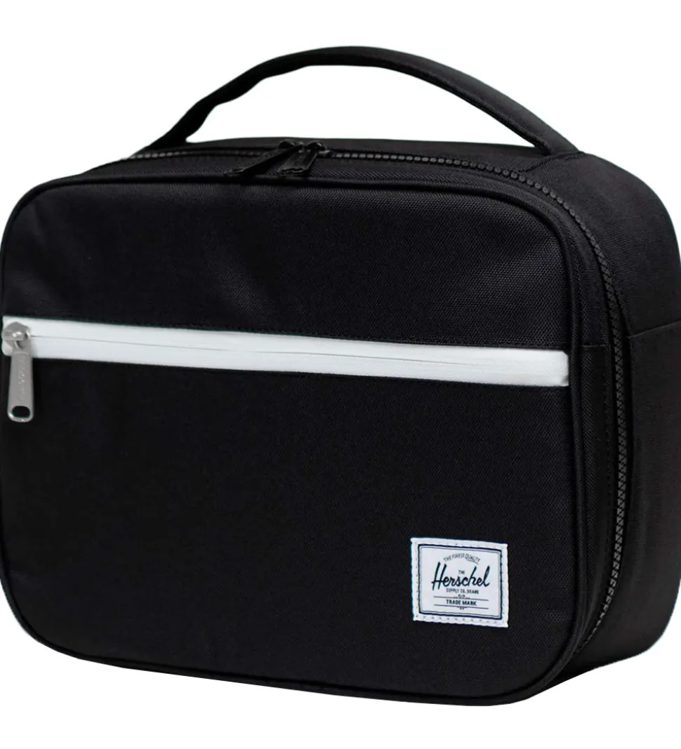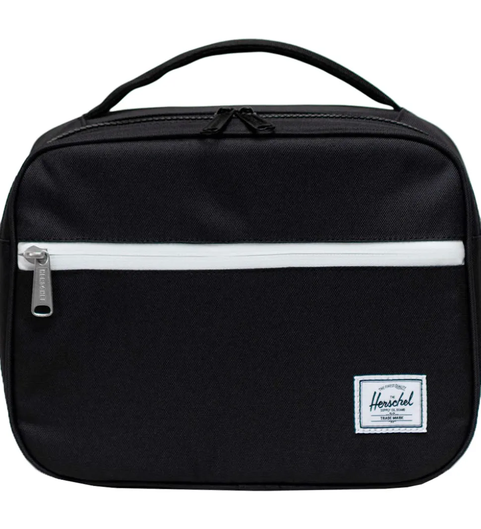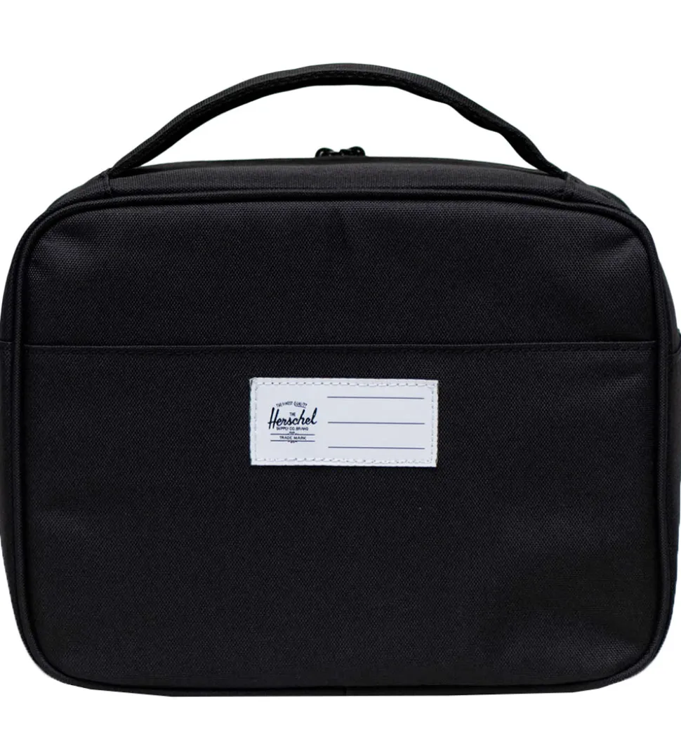 Smart Herschel køletaske i ensfarvet sort med en hvid logopatch fortil. Bagpå er der en hvid patch til at skrive navn på.