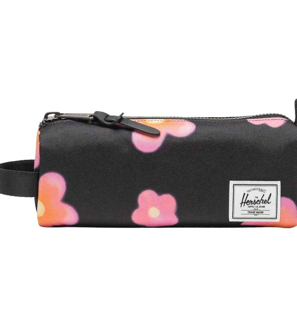 Skønt Herschel penalhus i sort med print af blomster i pink. Nederst i det ene hjørne er der et hvidt logopatch. Penalhuset har en aflang facon, og åbnes med en metal lynlås i toppen. Indvendigt er der stribet tekstil i sort og mørkegrå. Penalhuset har et praktisk håndtag i den ene side.