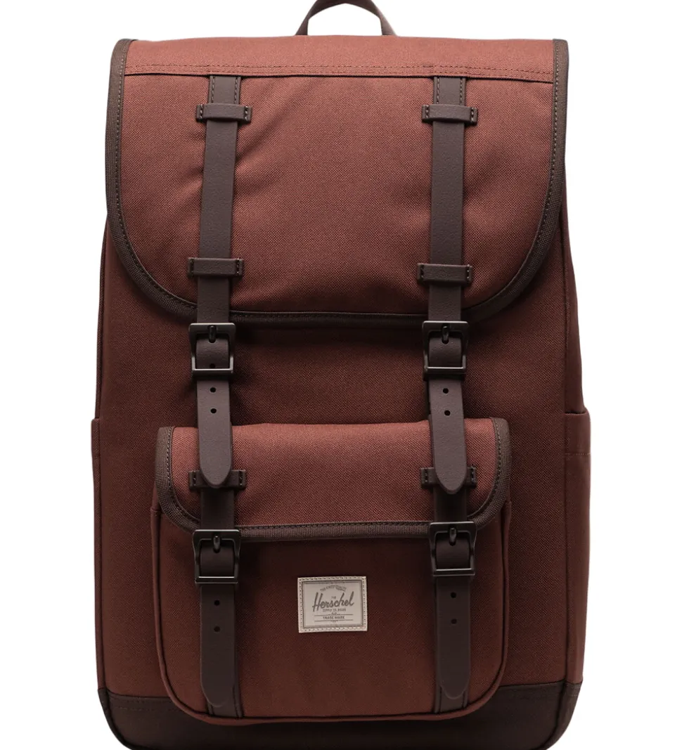 Flot Herschel rygsæk i en smuk, brun nuance med mørkebrune stropper i imiteret læder og en hvid logopatch på fronten. Indvendigt er der et stribet for.