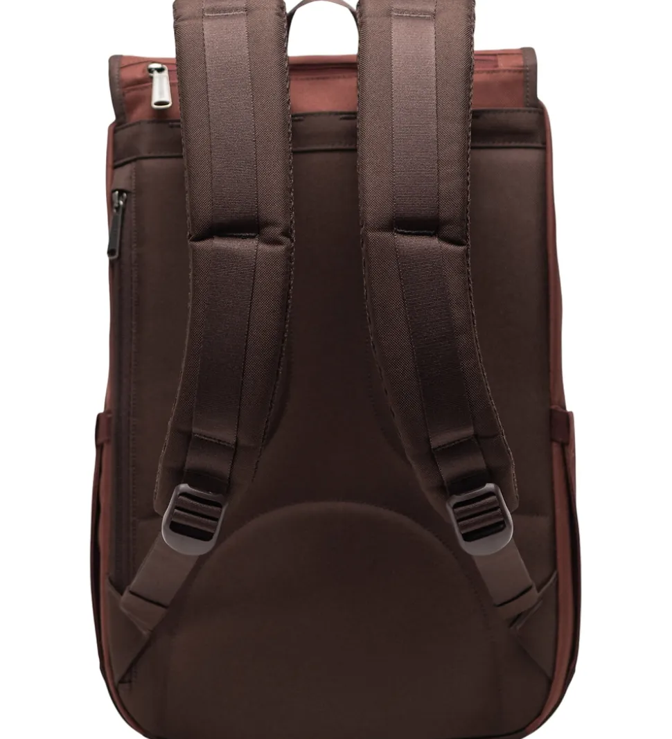 Herschel rygsækken åbnes med en klap med magnetiske knapper fortil. I toppen kan tasken strammes ind med snøre. Indvendigt er der et stort rum og en vatteret laptoplomme med plysfor, som har plads til en 15″/16″ computer. Laptoplommen kan også tilgås via en lynlåsåbning i siden af ryggen. Øverst på klappen er der en lynlåslomme med en hægte indvendigt til f.eks. nøgler.