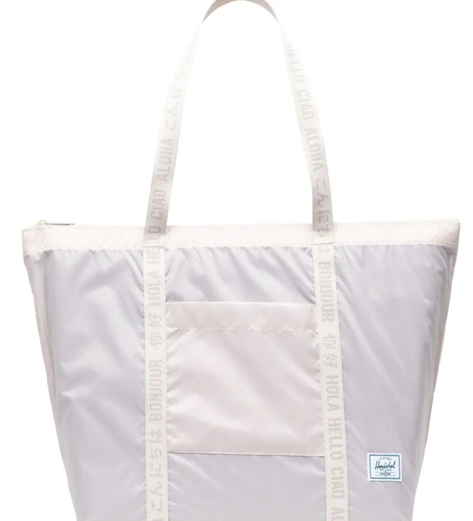 Flot Herschel taske i en lys beige med et diskret design. Tasken har to hanke med et sprogprint af “Hej” i forskellige sprog, der tilføjer charme og funktionalitet til hverdagsbrug. Perfekt til opbevaring med stil.