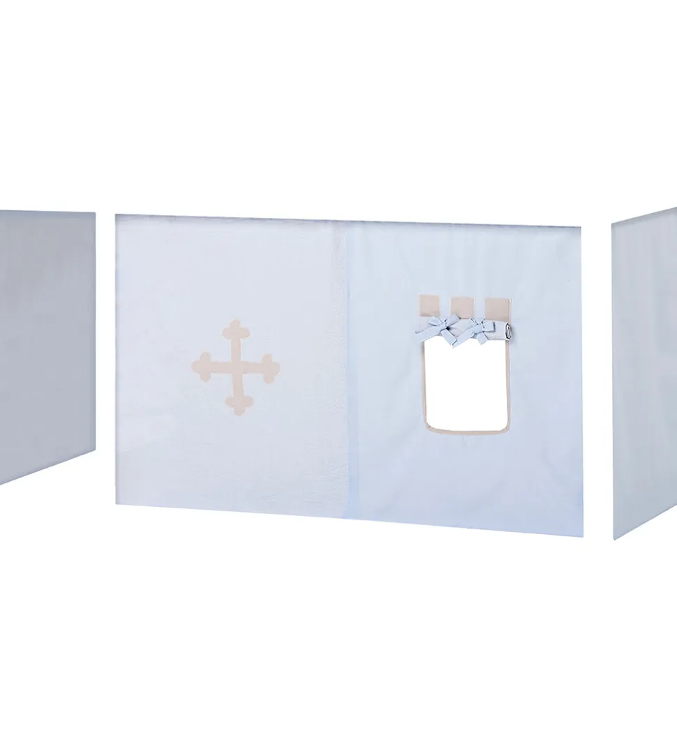 Hoppekids forhænget passer til den halvhøje seng fra Hoppekids, og det forvandler området under sengen til en hyggelig hule. Forhænget består af to endestykker samt to stykker, som dækker den ene langside hen til stigen op til sengen. I det ene stykke til langsiden er der en åbning med et gardin, som man kan rulle op eller lade blive nede.