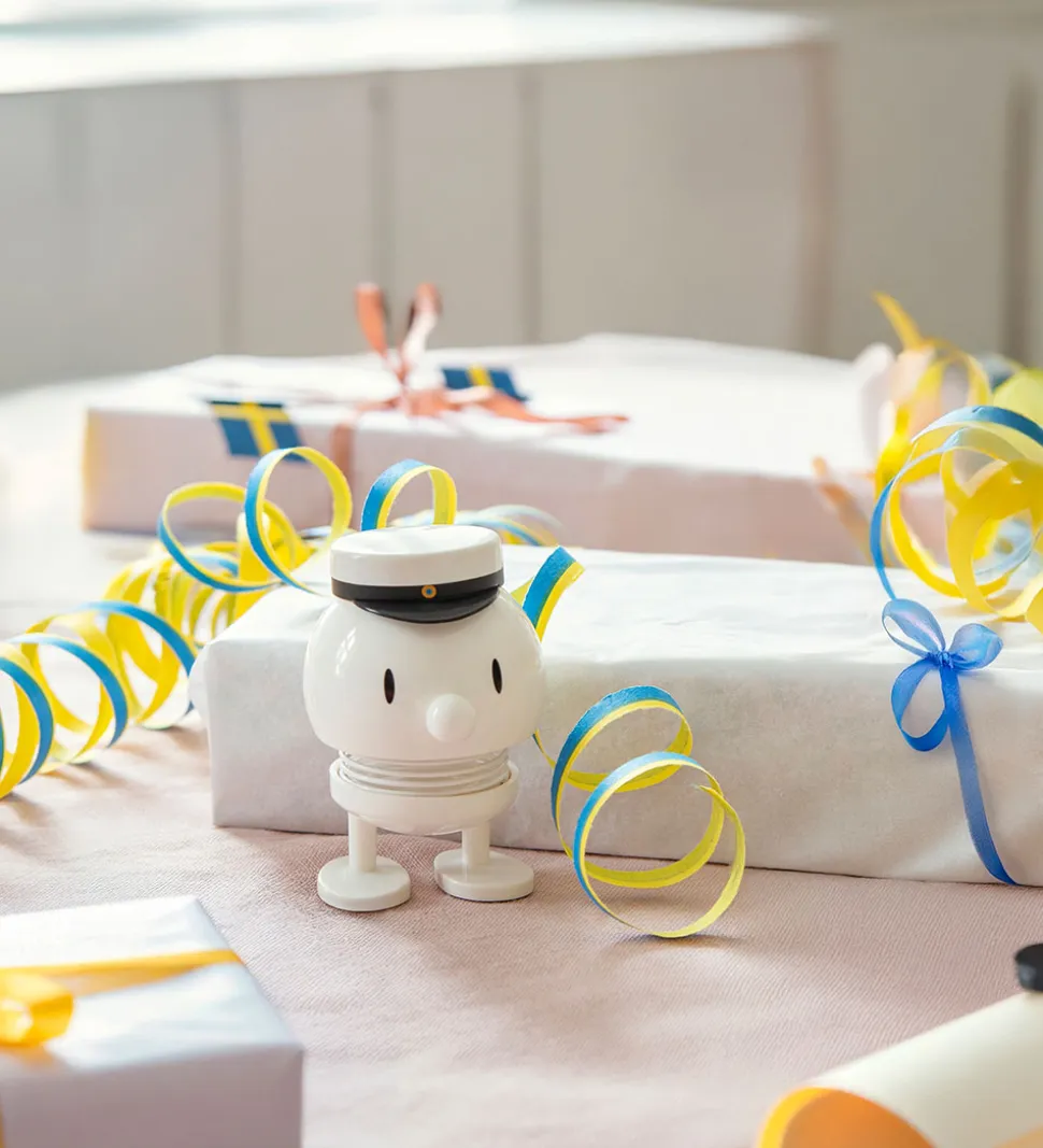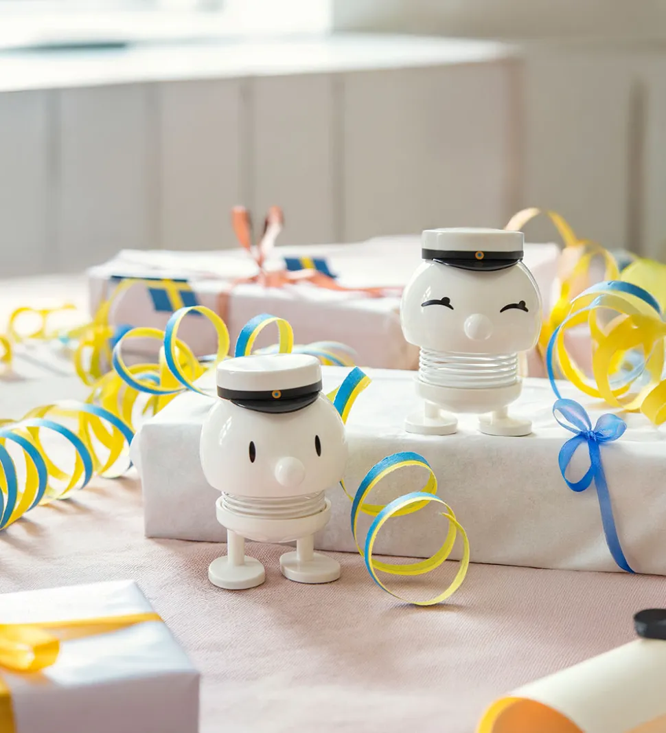 Hoptimisten har det velkendte look med en rund næse og den hoppende fjeder-krop. Under fødderne har den filt som sikrer at den lille, hoppende ven ikke hopper alt for langt væk.