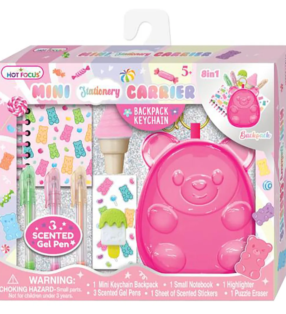 Skøn Hot Focus nøglering i en pink farve formet som en rygsæk. Sættet indeholder en lille notesbog, em highlighter, 3 kuglepenne med duft, klistermærker med duft og et viskelæder. Nøgleringen kan indeholde alle dele af sættet, så den fungerer som en mini taske. Sættet er perfekt til kreativ leg og opbevaring af småting.