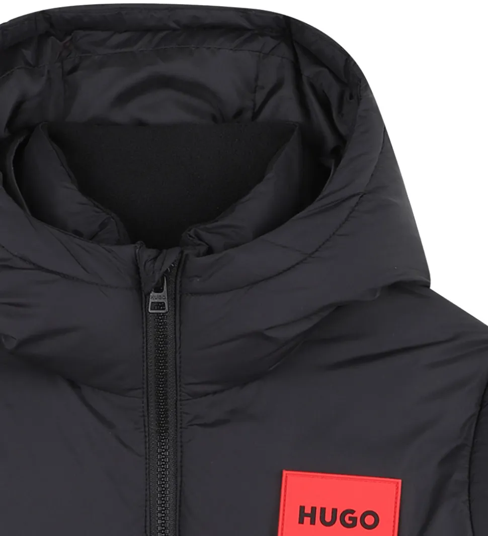Flot HUGO dynejakke i ensfarvet sort med et rødt logo på brystet. Dynejakken har en fast hætte, og ærmerne har elastikkanter.