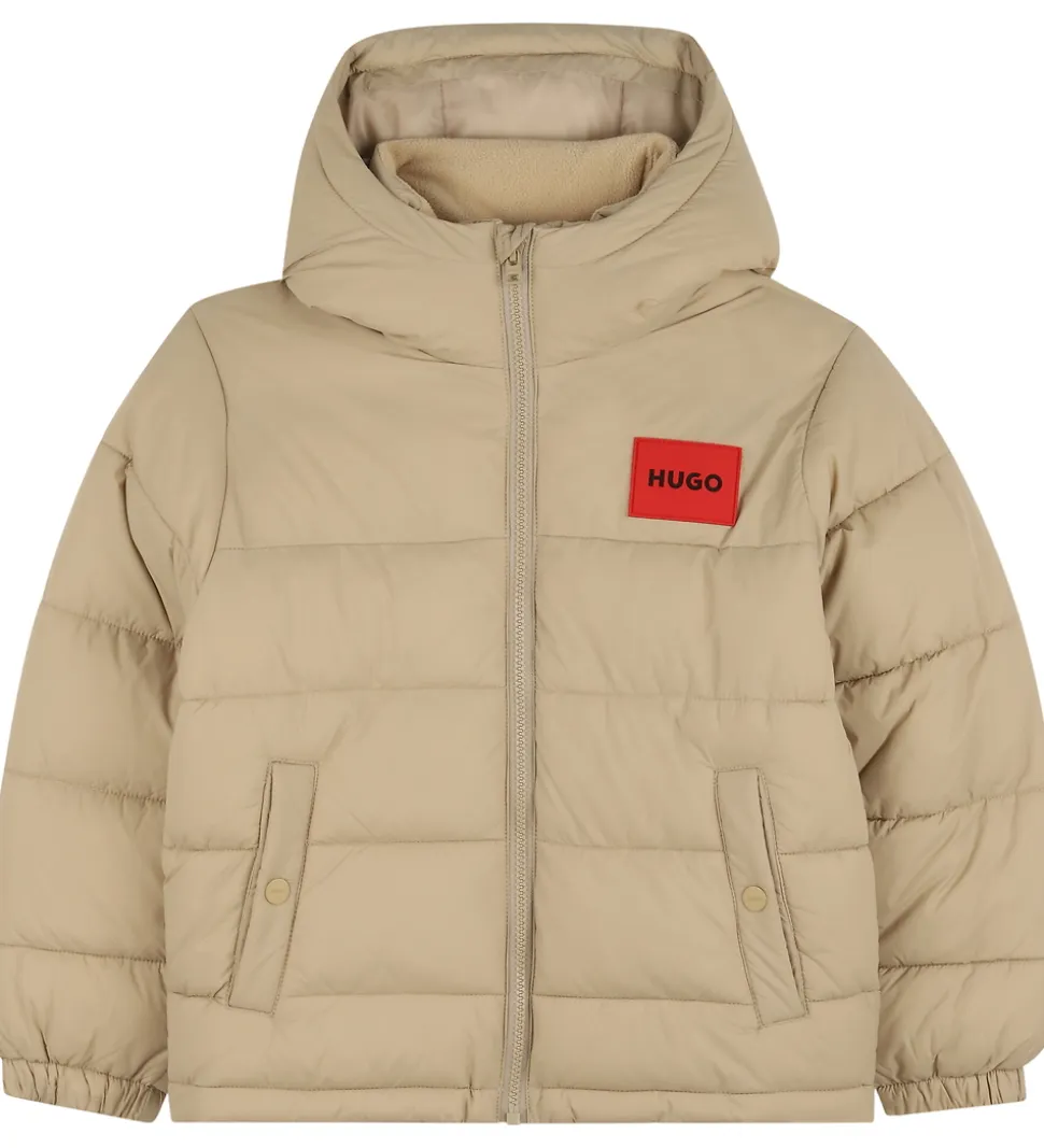 Lækker HUGO dynejakke i ensfarvet beige nuance med et rødt logo på brystet. Dynejakken har en fast hætte, og ærmerne har elastikkanter.