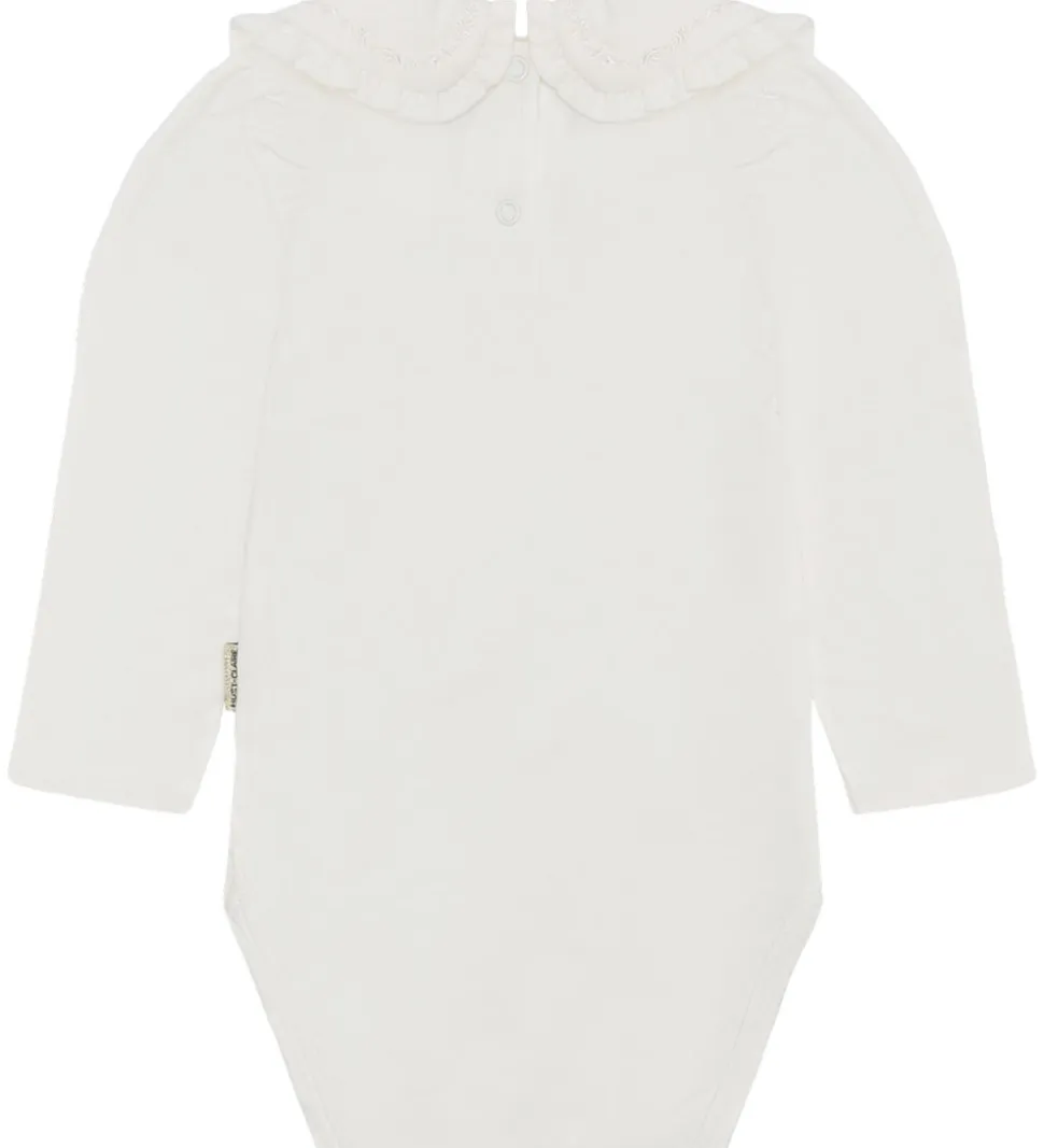 Elegant Hust and Claire body med lange ærmer i en ren hvid nuance. Bodyen har en smuk krave med fine flæsedetaljer, som giver et stilfuldt udtryk. Hust and Claire body er den perfekte tilføjelse til garderoben.