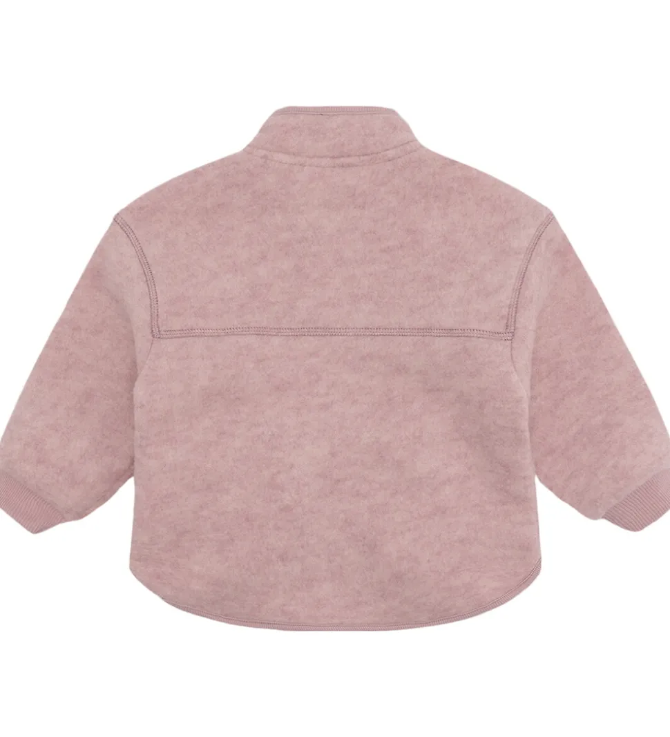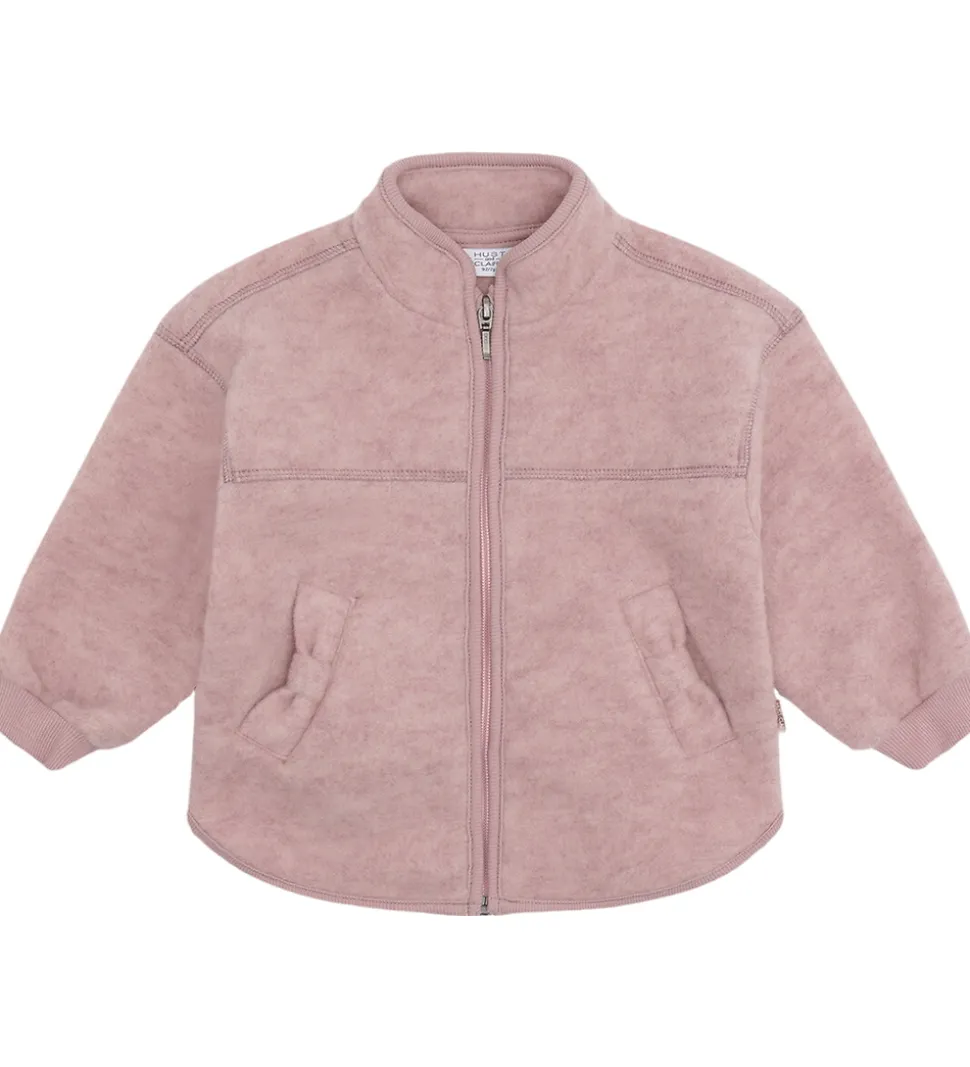 Behagelig Hust and Claire fleecejakke i en støvet, rosa nuance. Fleecejakken har et enkelt design med en gennemgående lynlås med hagebeskytter foran.