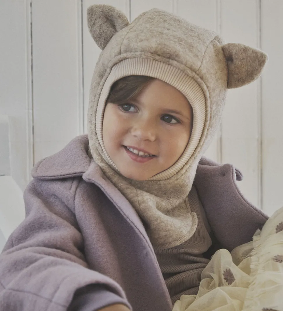 Fin Huttelihut elefanthue af lunt uldfleece i en meleret beige. Huttelihut elefanthuen består af to lag og har en rund hovedform, der er suppleret med søde ører på toppen.
