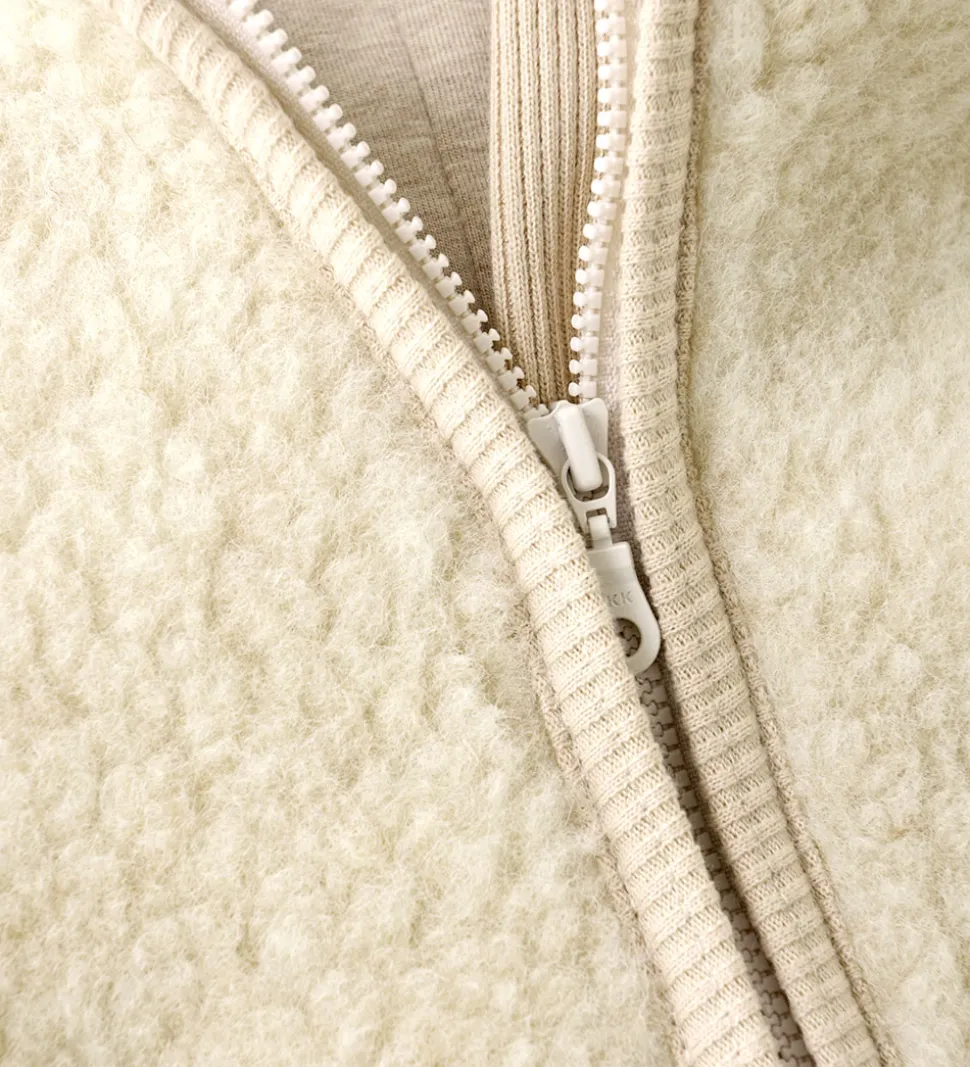 Dejlig Huttelihut køredragt af lunt teddyfleece i en meleret, lysebeige nuance.