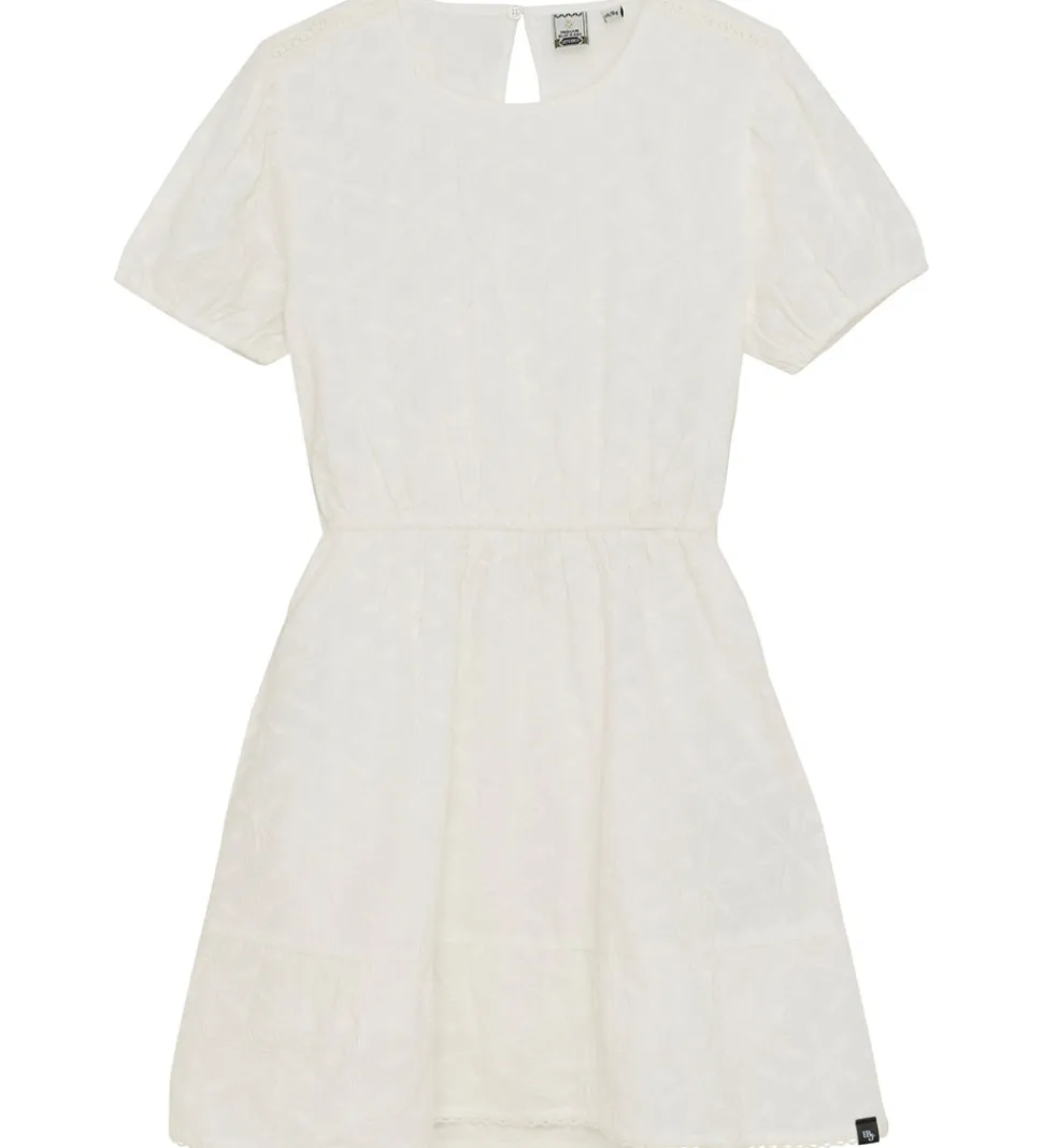 Skøn Indian Blue Jeans kjole i hvid med korte ærmer og et fint, broderet mønster. Kjolen har en feminin pasform, hvilket gør den til et alsidigt valg til forskellige anledninger. Kjolen er lavet i en let, fastvævet kvalitet, og den består af to lag, så den ikke fremstår gennemsigtig.