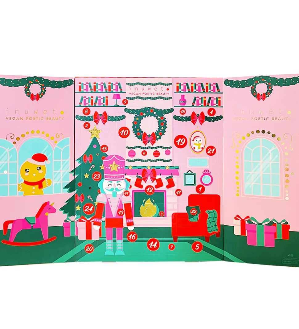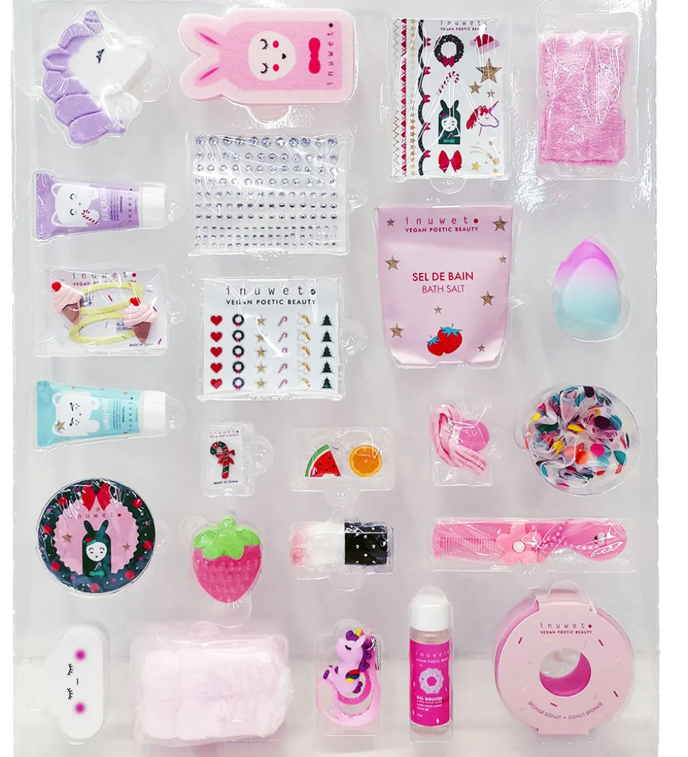 Inuwet julekalenderen indeholder en masse plejeprodukter og forskelligt tilbehør som håndcreme, badebomber og hårbånd, der gør nedtællingen til jul ekstra hyggelig.