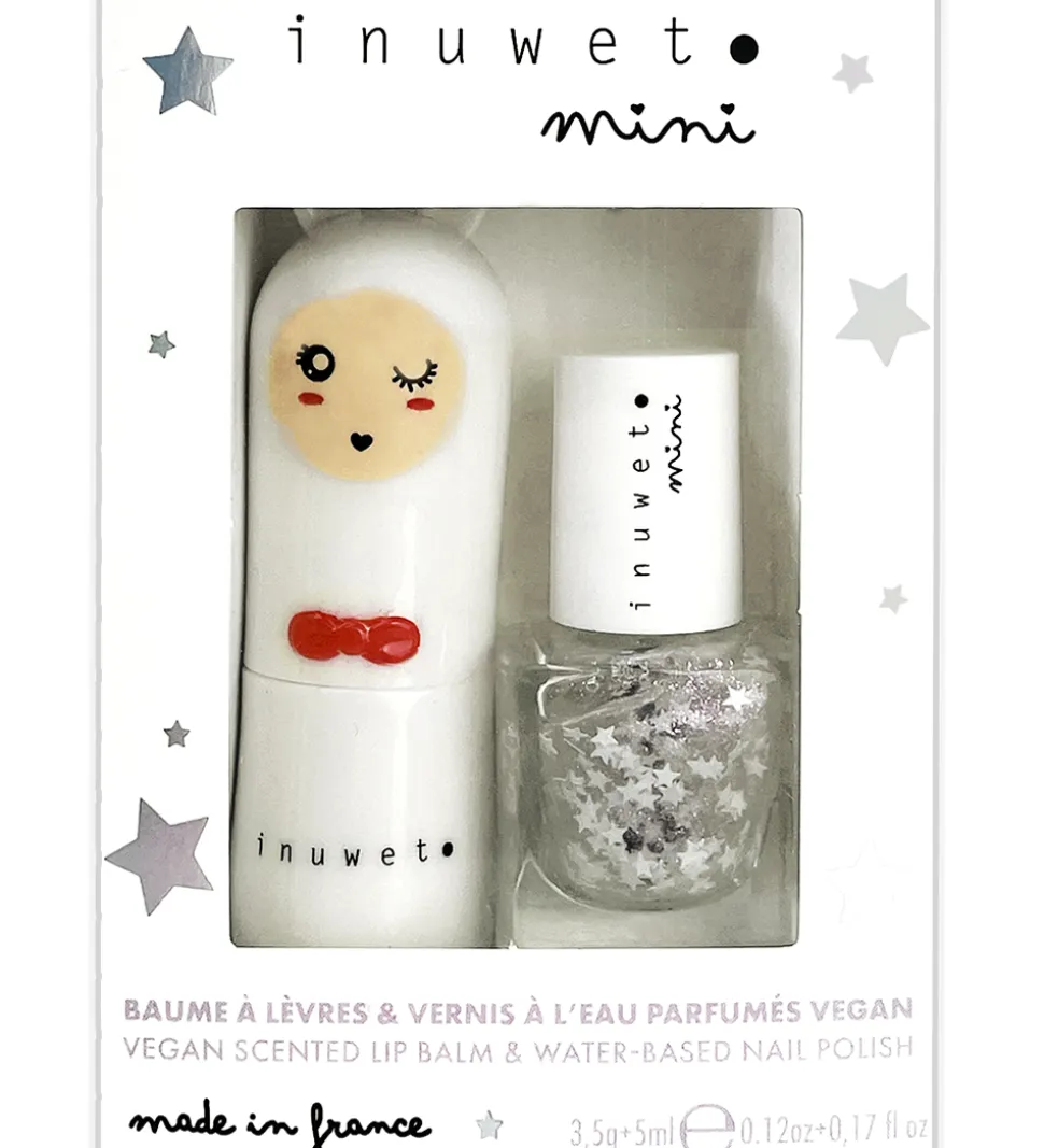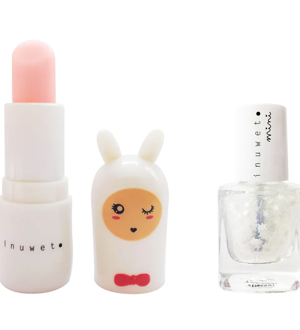Lækkert Inuwet sæt med en læbepomade med et kanin-etui i en hvid farve med ansigtsprint og søde ører på toppen og i luftvarianten Cotton Candy samt en neglelak, der er transparent med glimmer og stjerner.