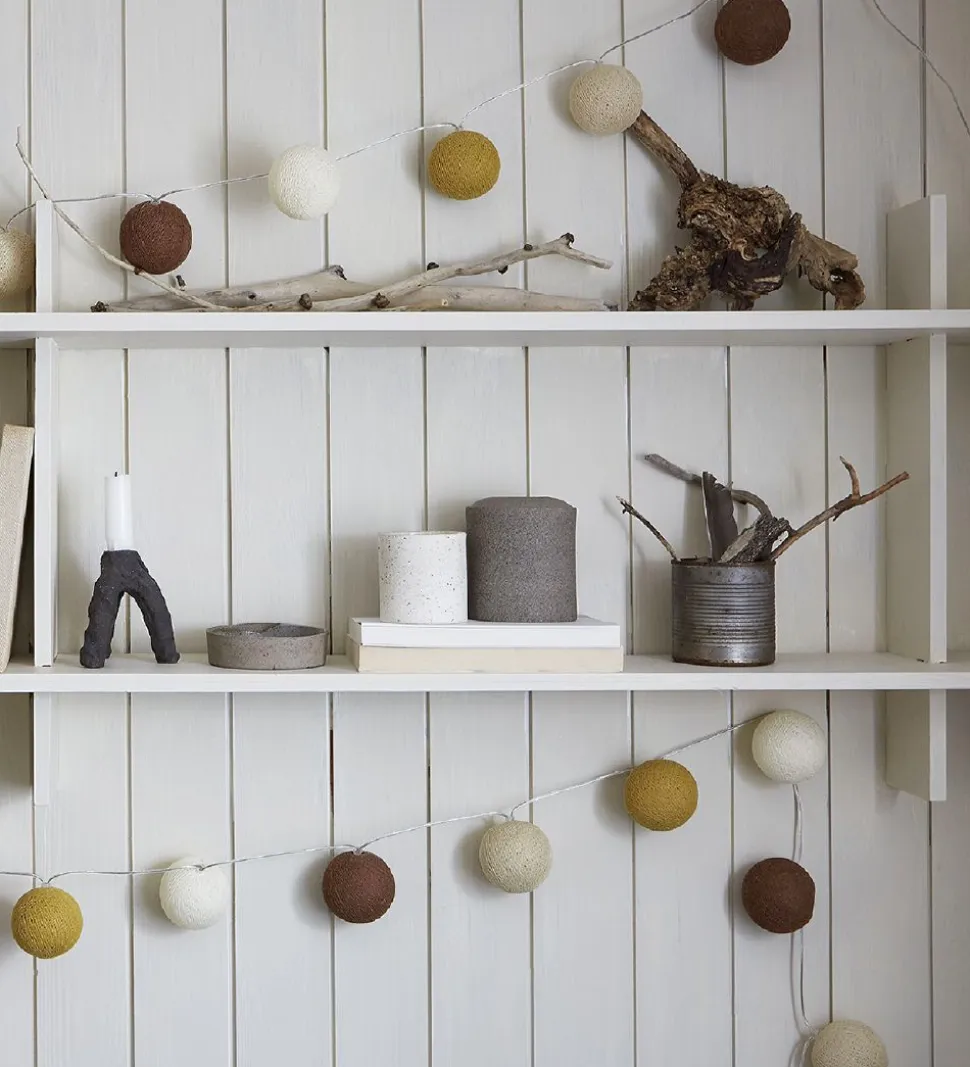 Flot Iris Lights lyskæde i farven “Biscotti” med kugler i hvide, brune og gule nuancer.
