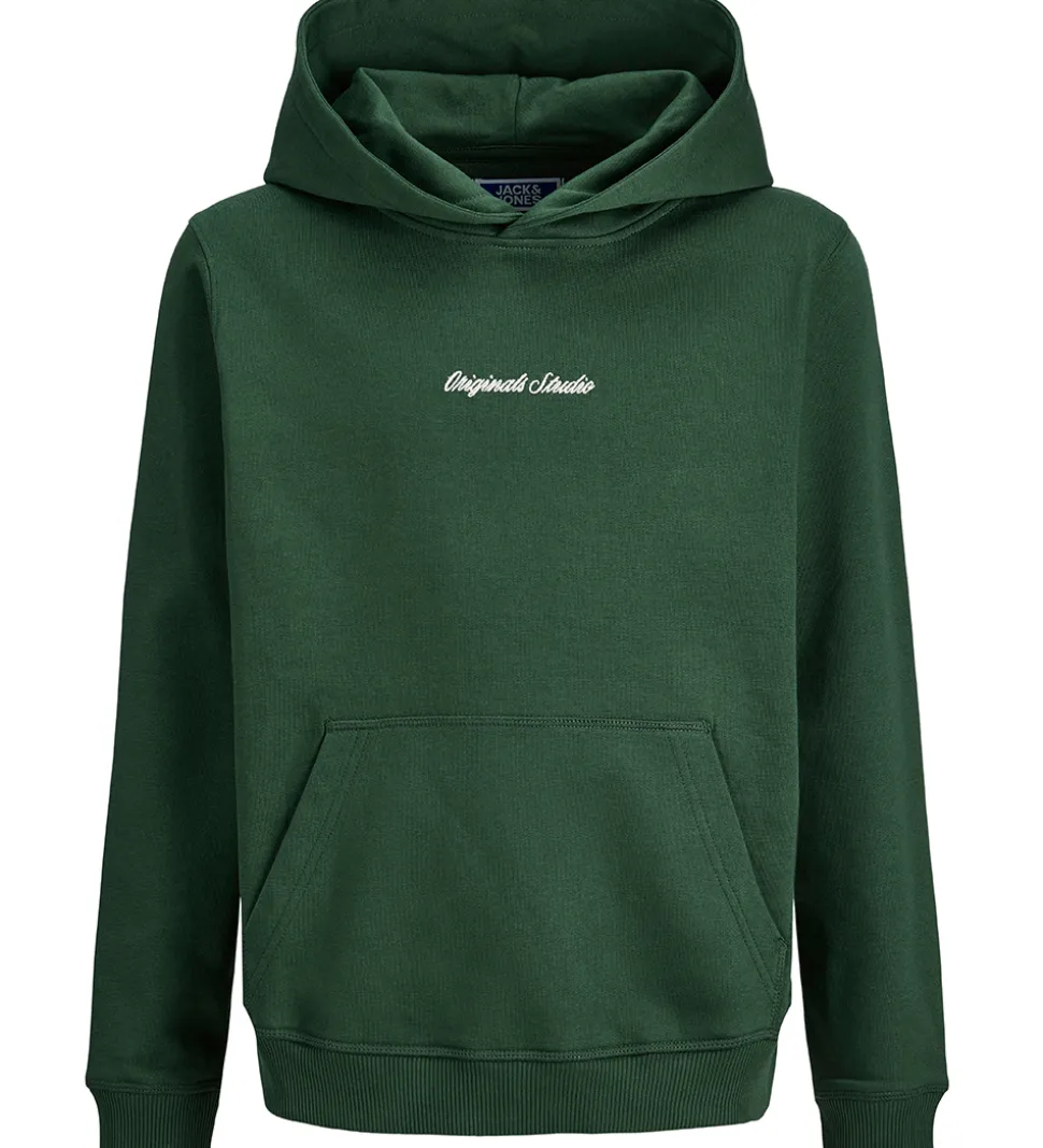 Smart hættetrøje fra Jack & Jones i mørkegrøn med teksten “Originals Studio” broderet på brystet. Hættetrøjen har en blød hætte og en rummelig kængurulomme. Den har ribkanter ved alle åbninger, og indvendigt er der blødt, børstet bomuld.