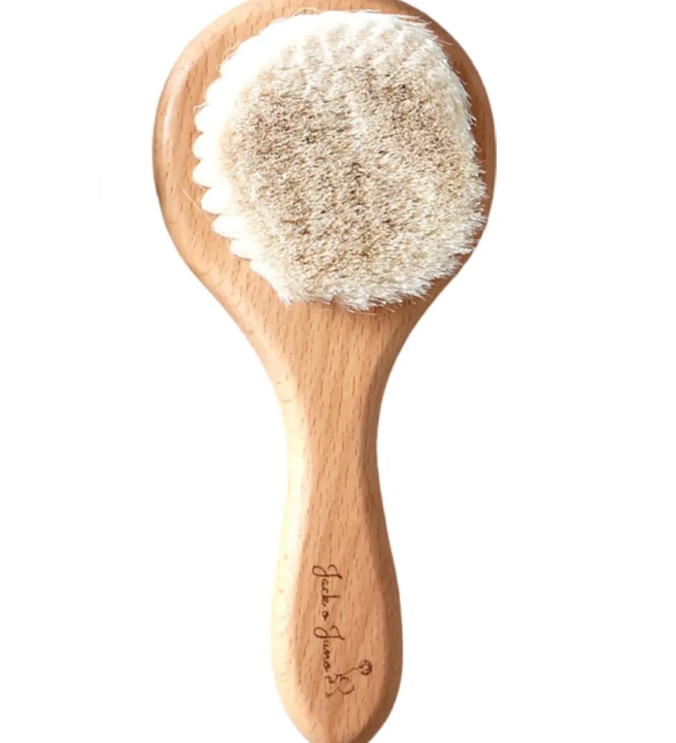 Elegant Jack o Juno hårbørste fremstillet i bøgetræ. Jack o Juno børstens blide børstehår af gedehår er skånsomme mod hovedbunden og sikrer at det ikke er nødvendigt at trykke i hovedbunden, hvilket gør børsten til det perfekte valg til den nyfødte.