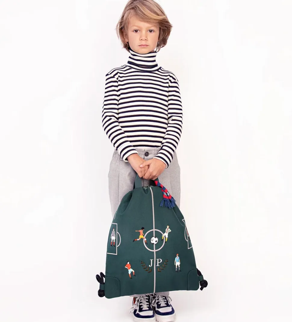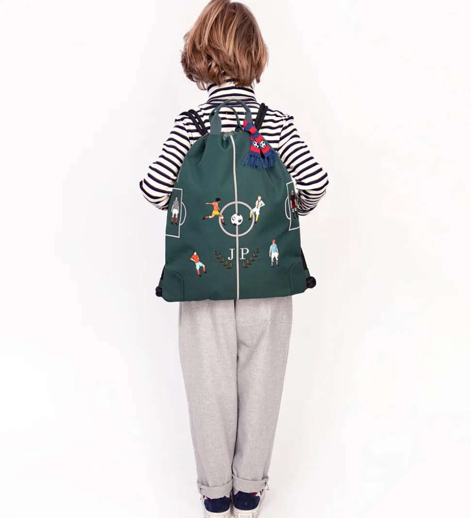 Sej Jeune Premier rygsæk i grøn, med broderinger på fronten af fodboldspillere og en lille fodbold i gummi placeret i midten. På det foreste håndtag er der vedhængt et kort stykke stof i stribet blå og rød, med en fodbold i toppen, så det ligner et halstørklæde.