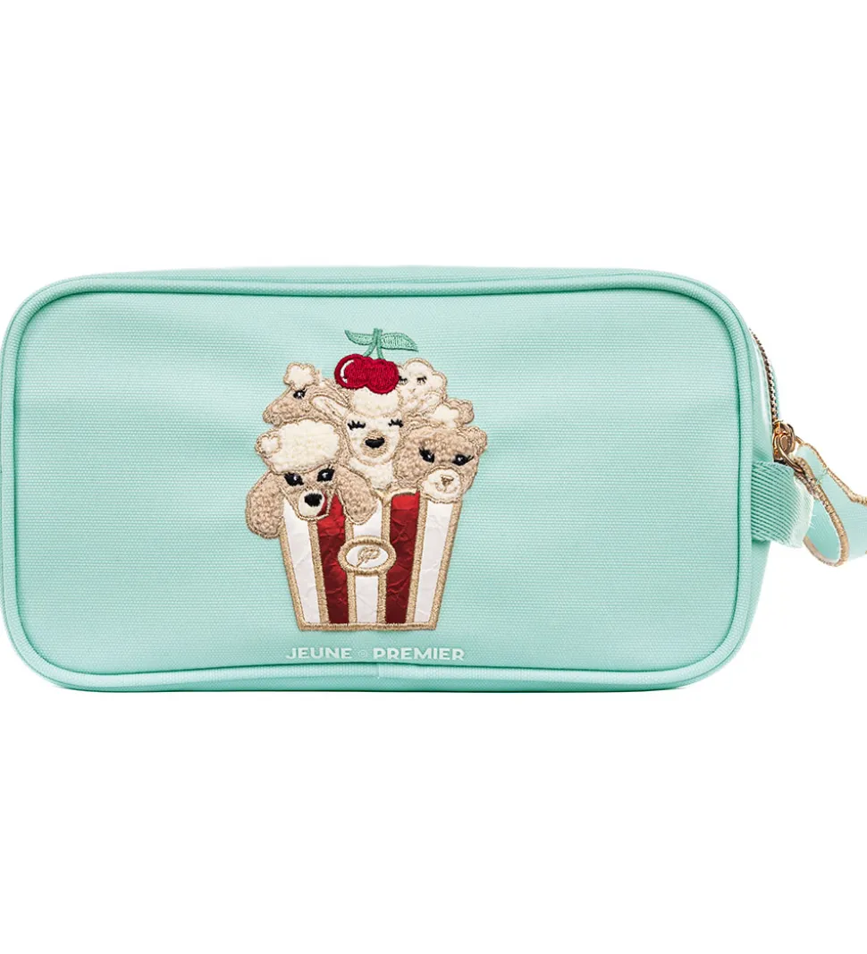 Sød Jeune Premier toilettaske i turkis, og på fronten er den dekoreret med et popcornbæger med striber i rød og hvid, og det er fyldt med søde plysbamser.