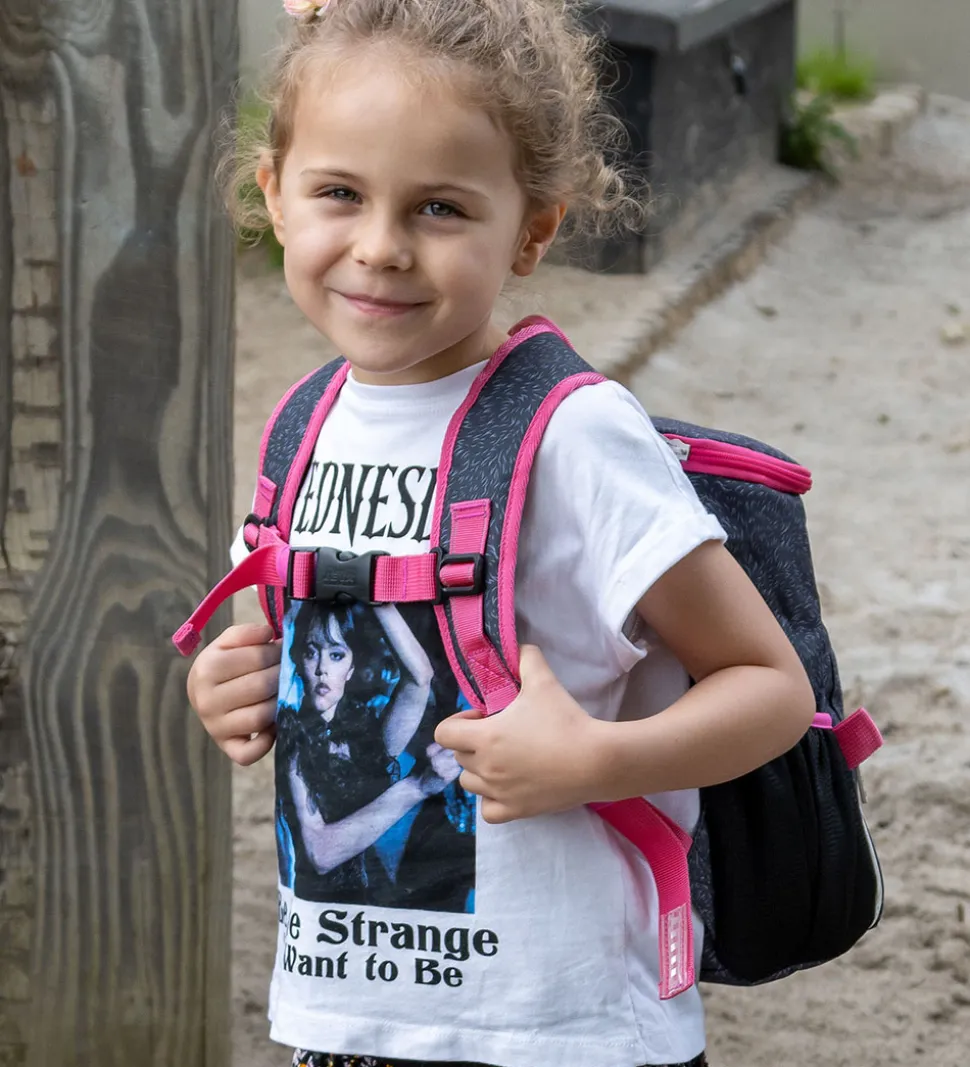 Skøn Jeva børnehavetaske i et design med sortgrå pels-print og hvidt enhjørningekat-print med pink og multifarvede detaljer.