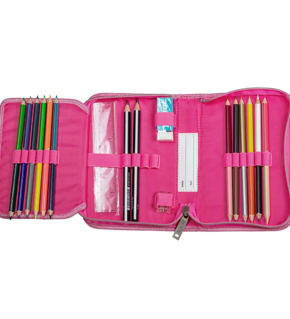 Penalhuset åbnes med lynlås og består af ét stort rum, som opdeles af en funktionel klap. Rummet har et navneskilt og mange elastikstropper til at holde styr på skriveredskaberne. Klappen har en lynlåslomme og sort meshlomme til skoleskemaet på den ene side.