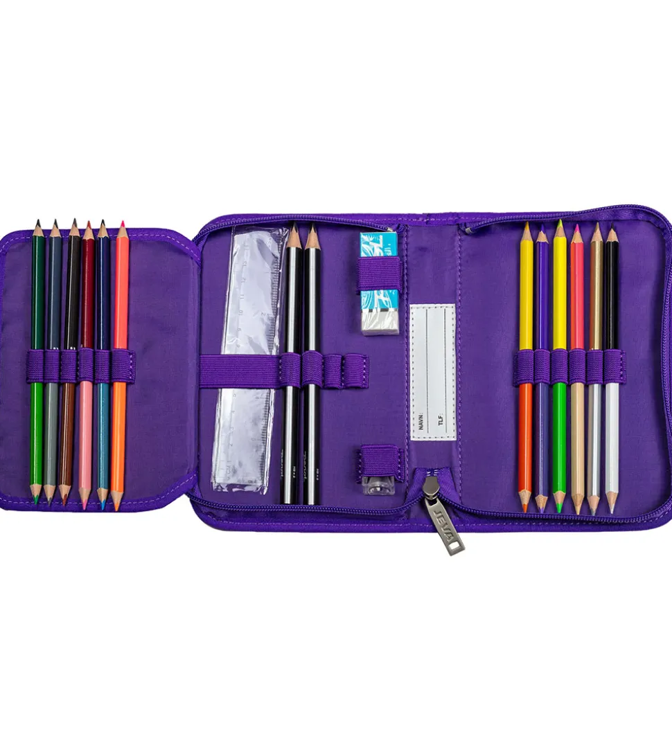 Flot Jeva penalhus i lilla, blå og pink med glitrende effekt samt et sødt enhjørningsprint.