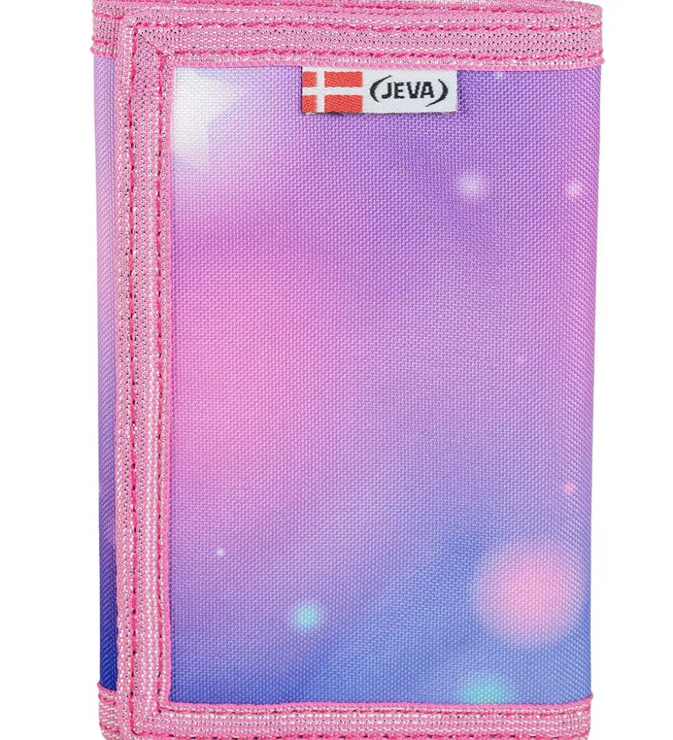 Fin Jeva pung med et mønster i rosa og lilla nuancer og med rosa kanter.