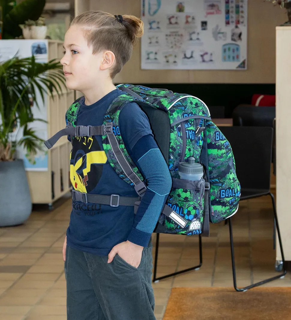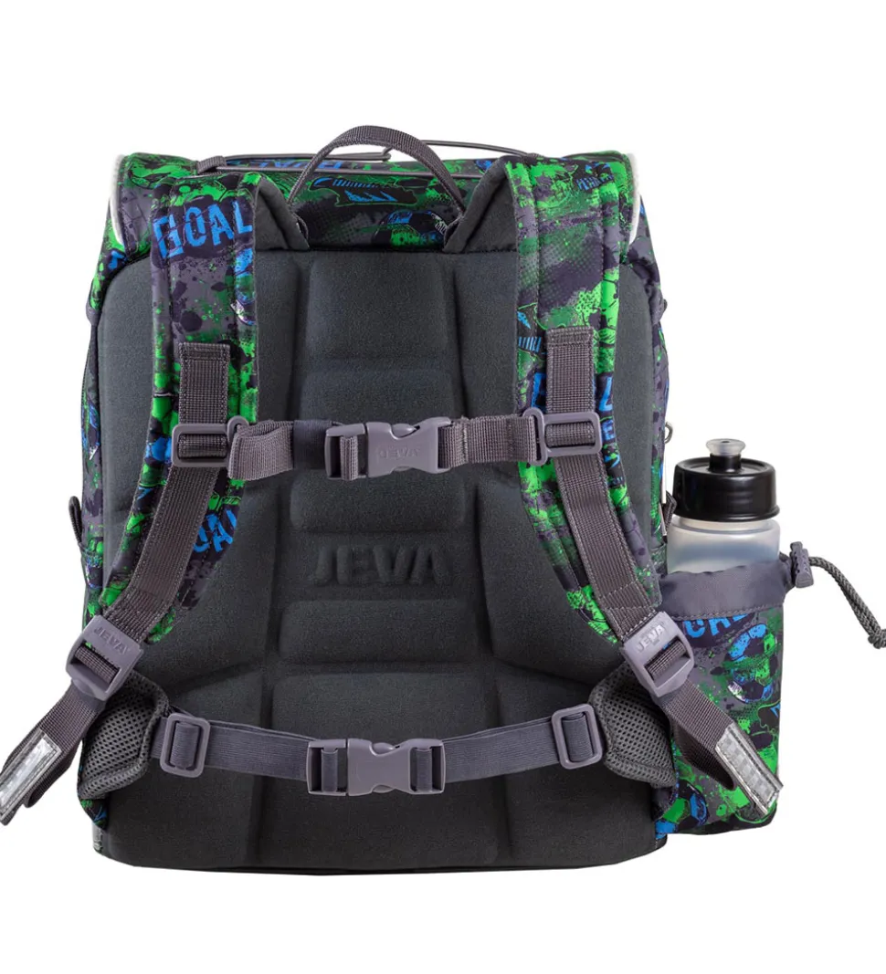 Sej Jeva skoletaske i et fodboldtema med grønne, blå og hvide farver og med en stor fodbold fortil. Skoletasken har detaljer og kanter i mørkegrå.
