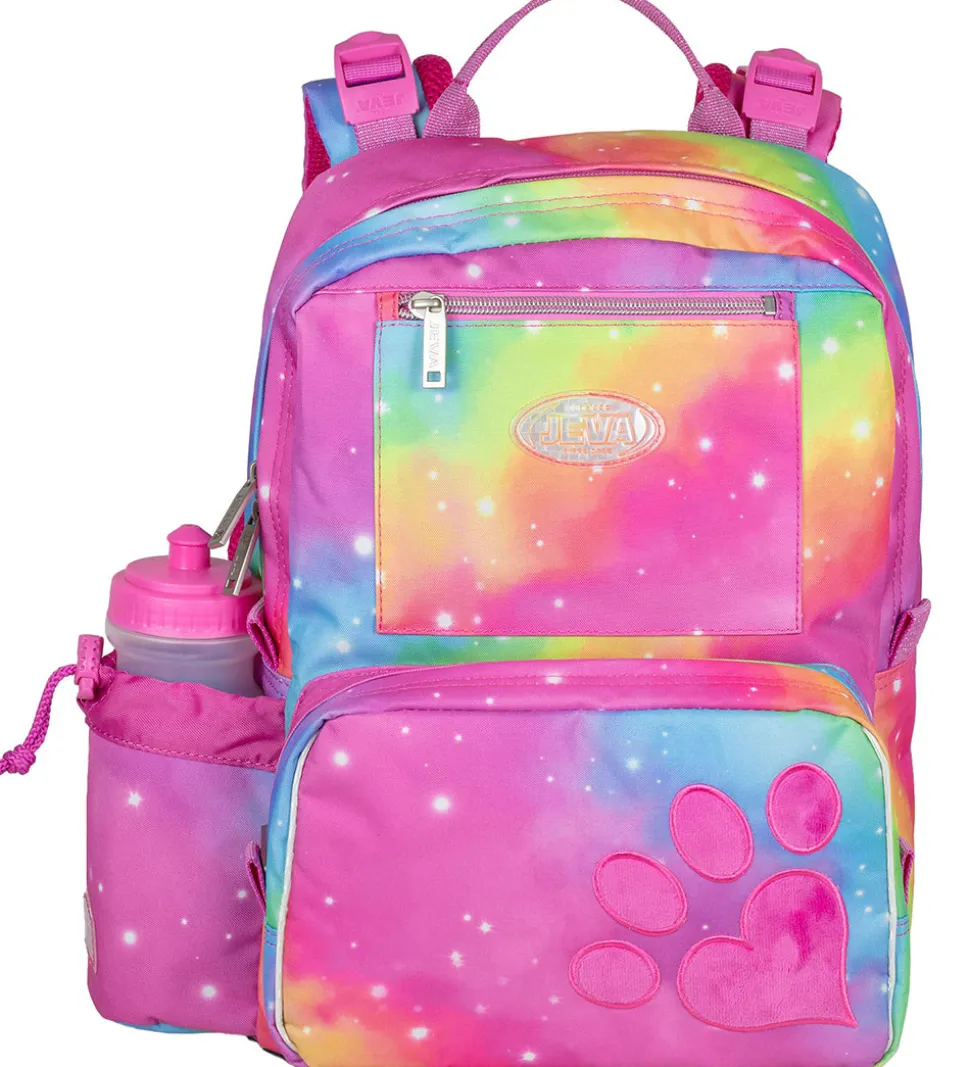 Praktisk Jeva skoletaske i rosa og med regnbuefarver samt et sødt potetryk på fronten.