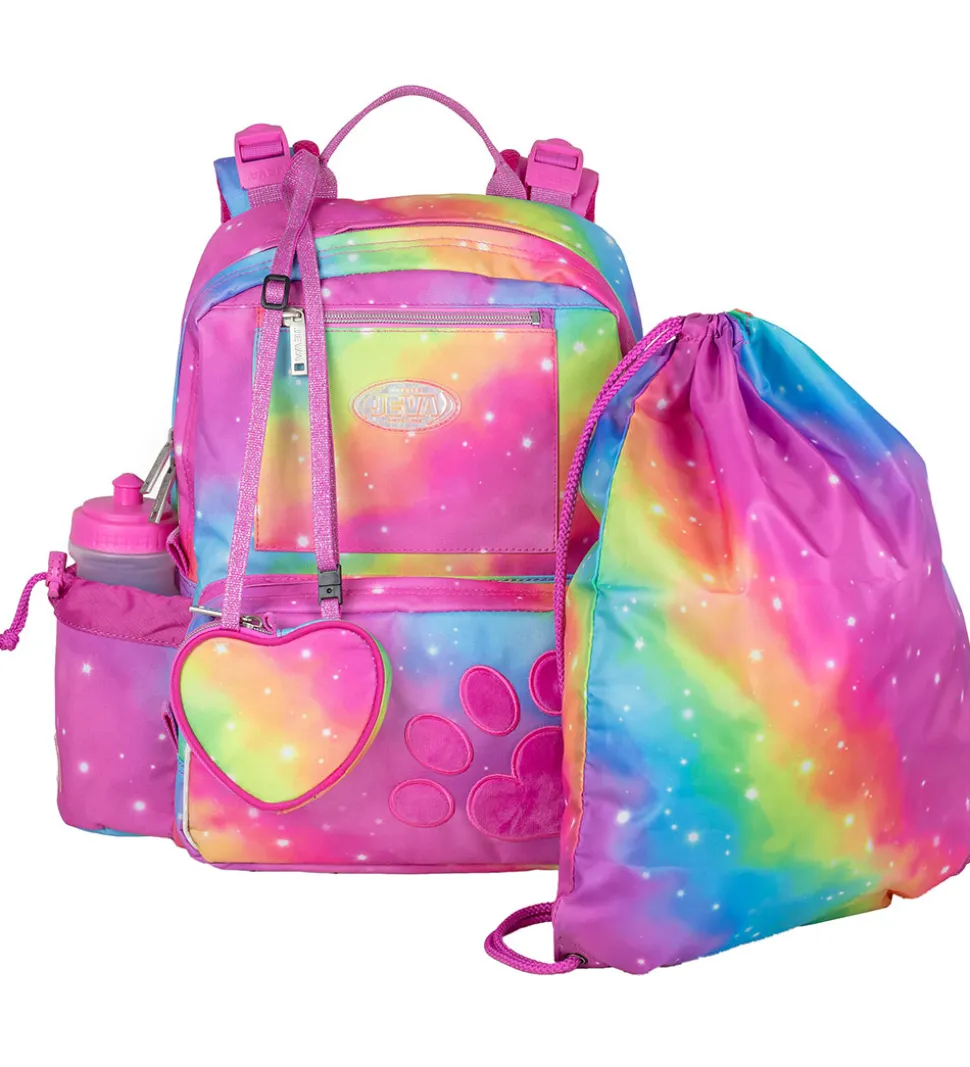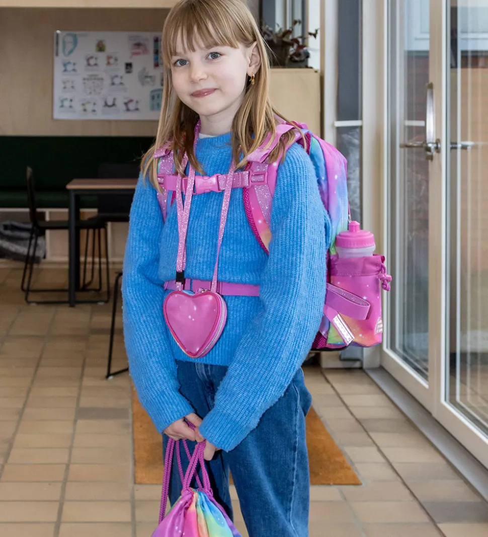 Derudover medfølger der en gymnastikpose, der f.eks. kan bruges til idrætstøjet, og desuden en lille hjertetaske, som både kan bæres over skulderen og som bæltetaske.