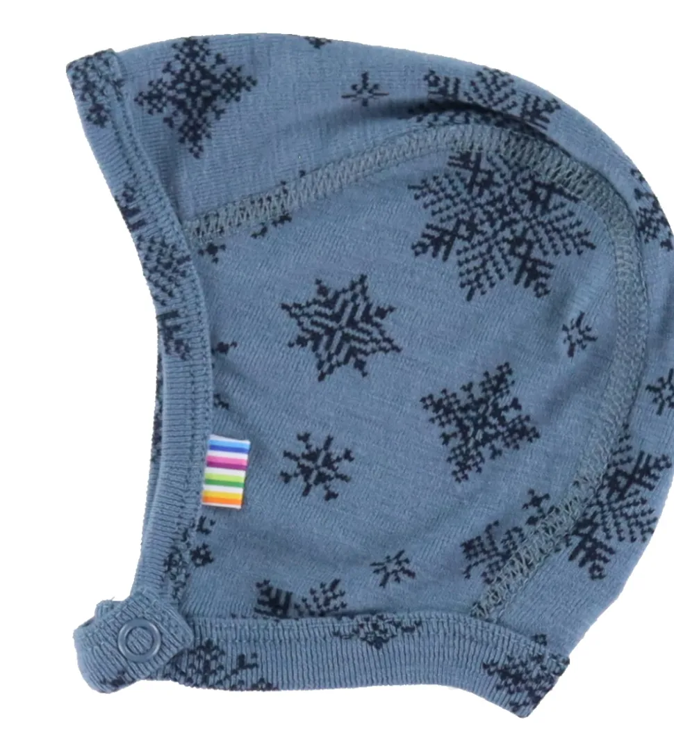 Dejlig Joha babyhjelm i en flot, blå farve med sorte snefnug i forskellige former og størrelser.