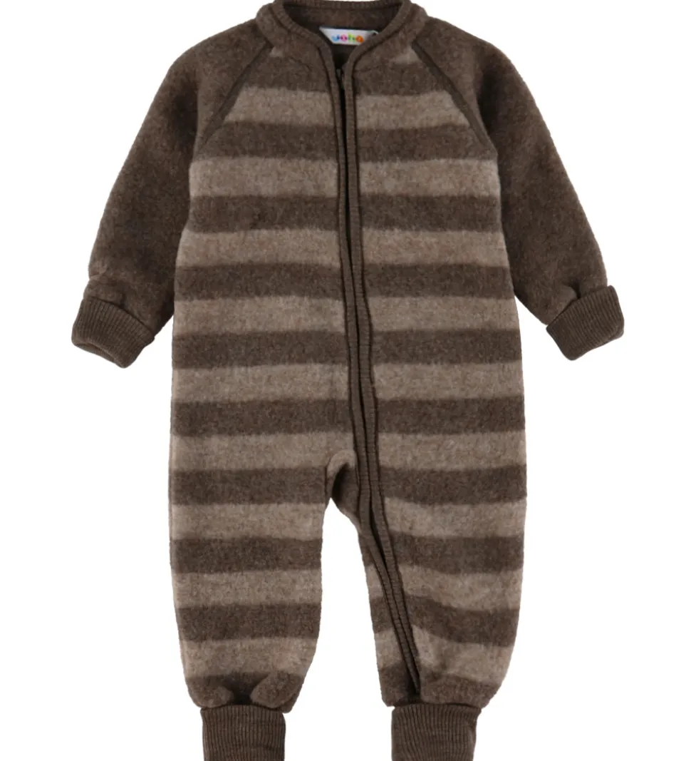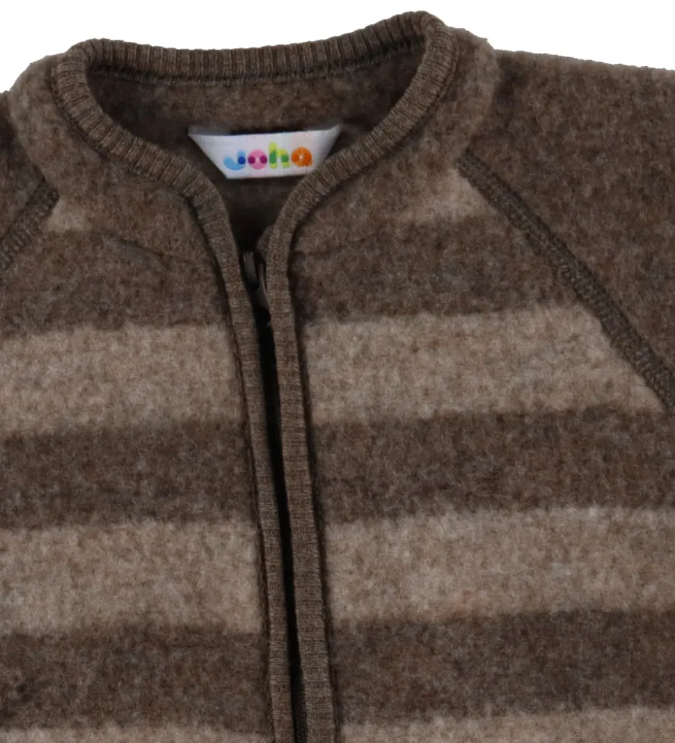 Flot Joha køredragt med vandrette striber i brune nuancer og ensfarvede ærmer. Køredragten har lynlås fra hagen til venstre fod. Den har lange ærmer og lange ben med brede ribkanter. Køredragten er fremstillet i en kraftig kvalitet i merinould.