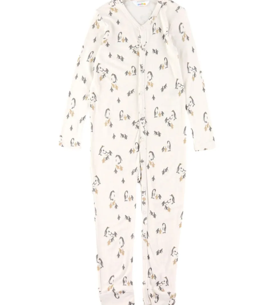 Flot Joha natdragt i lys beige med print af pingviner. Joha natdragten har en rund halsudskæring og gennemgående knapper fra hagen til venstre fod. Den har lange ærmer og lange ben. Natdragten er fremstillet af bambus viskose.