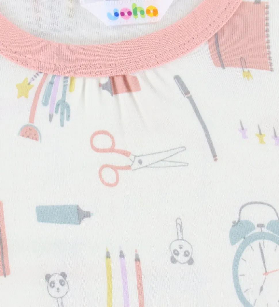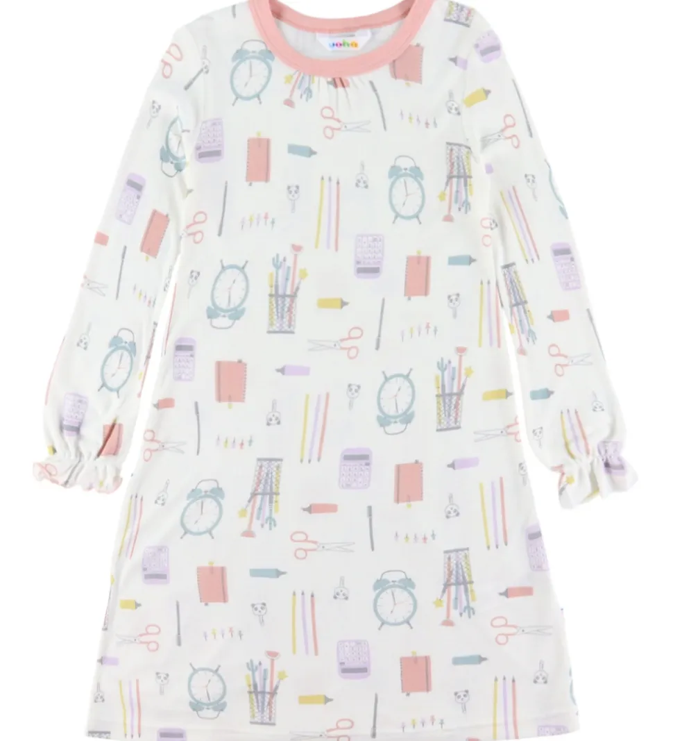 Fin natkjole fra Joha i hvid med farverigt print af skoleartikler. Natkjolen har lange ærmer og en rund halsudskæring med rosa kant. Elastiske kanter ved håndleddene giver en flot pasform. Kjolen er fremstillet af bambus viskose.