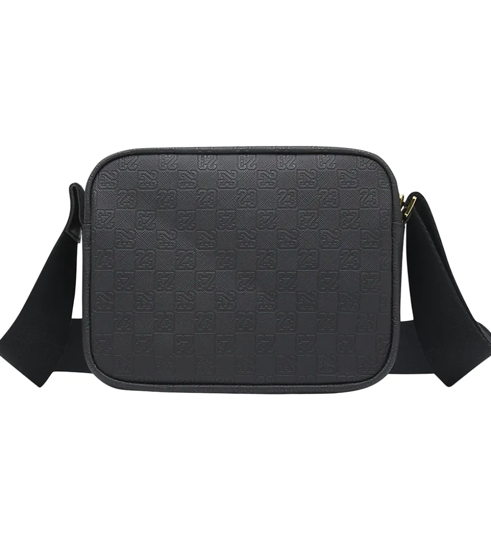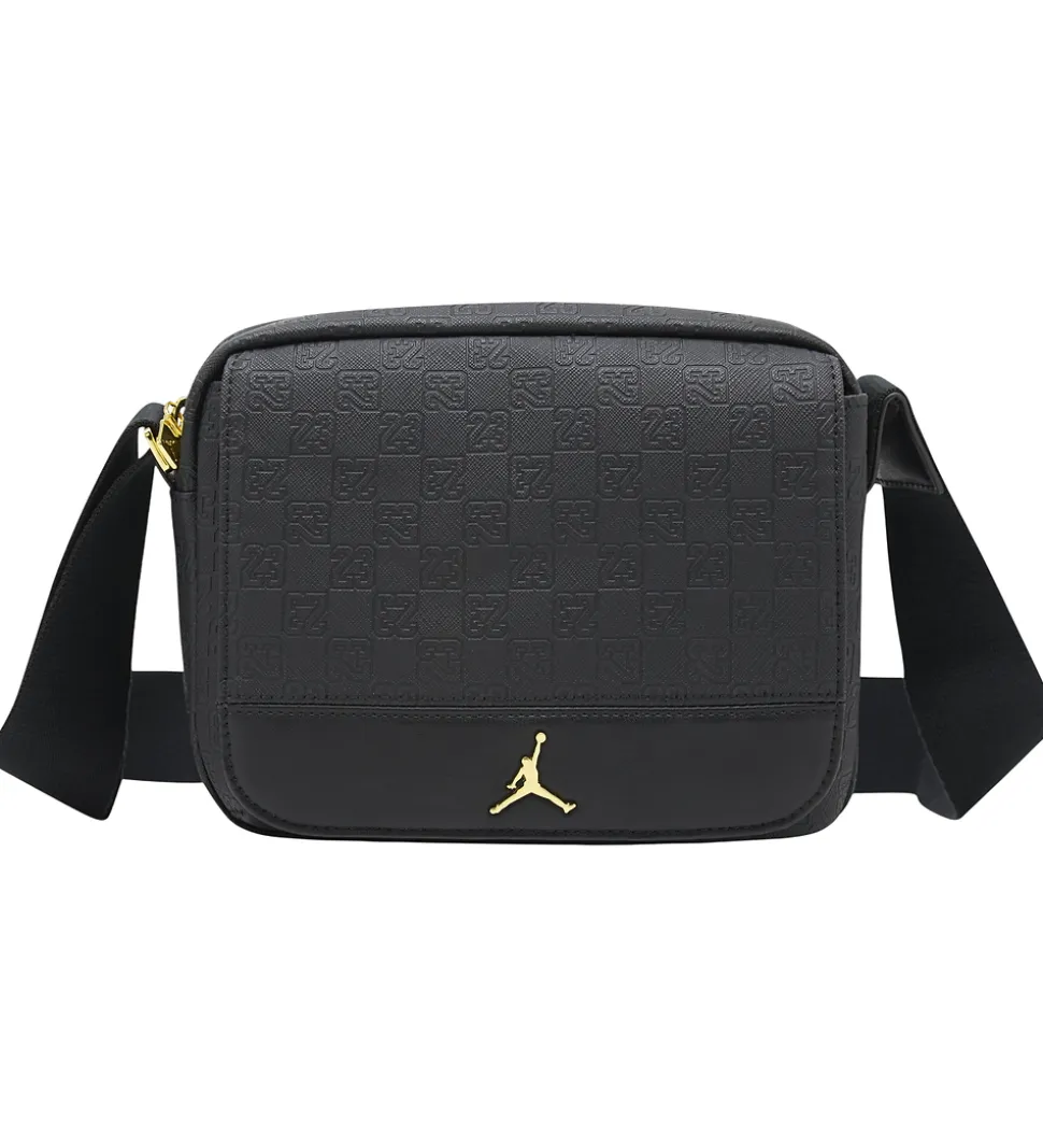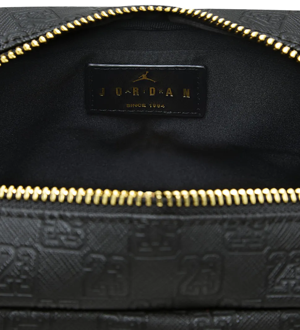 Elegant Jordan skuldertaske i imiteret sort skind med tallet “23” præget i materialet. Skuldertasken har et flot mønsterprint og det ikoniske Jordan-logo i guld på fronten.