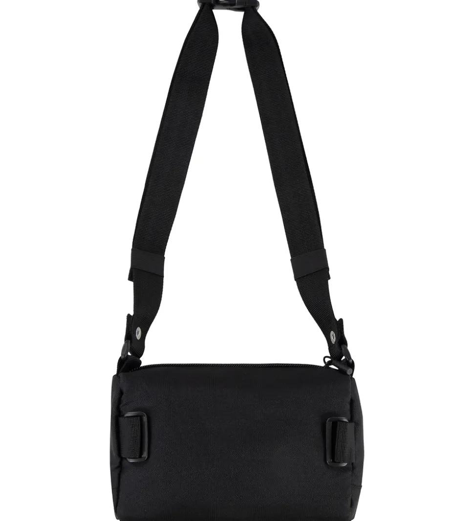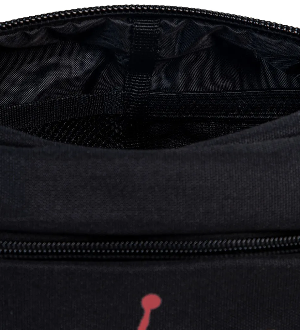 Flot Jordan skuldertaske i sort, og fortil er der trykt et logo i hvid og rød.
