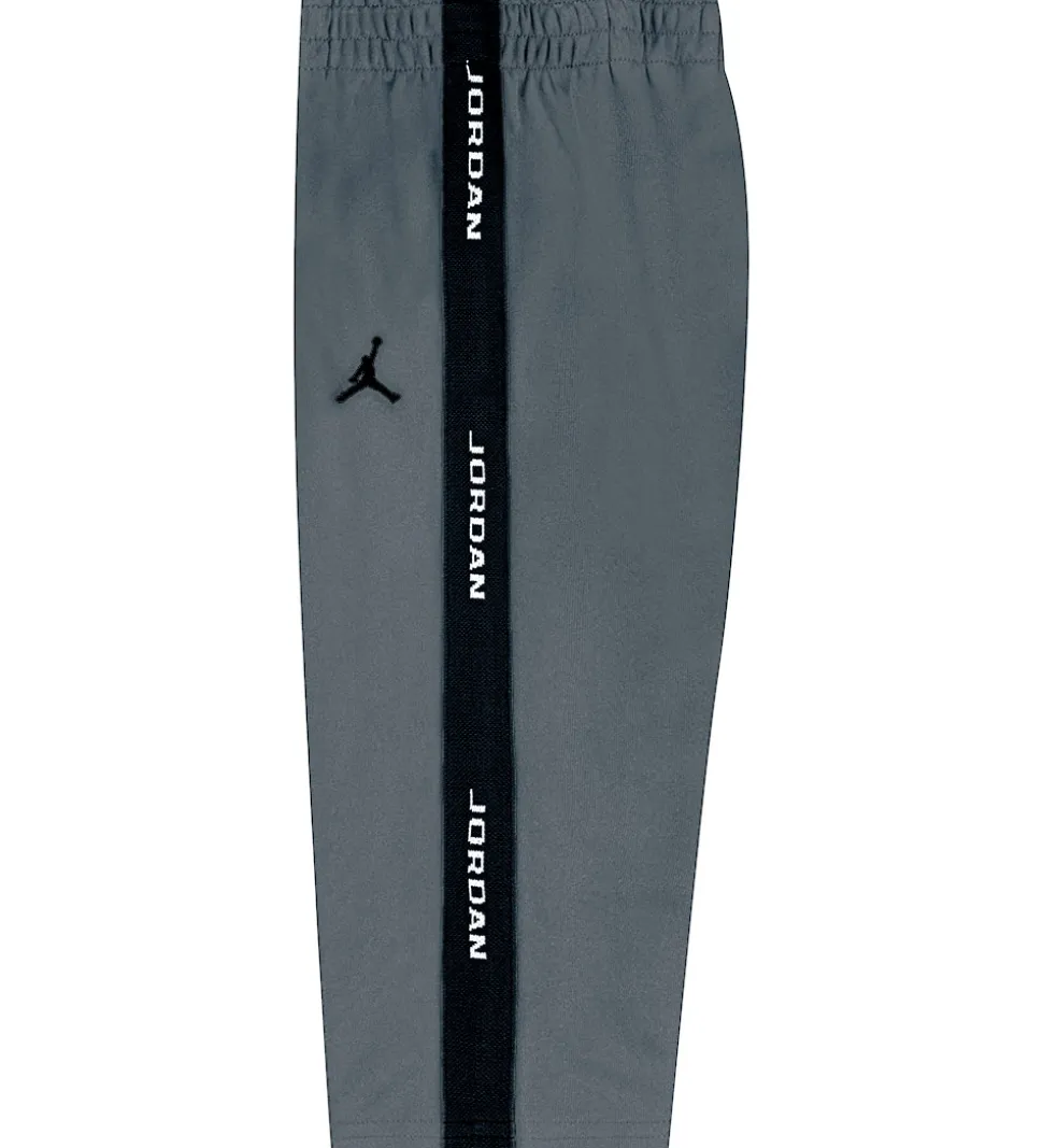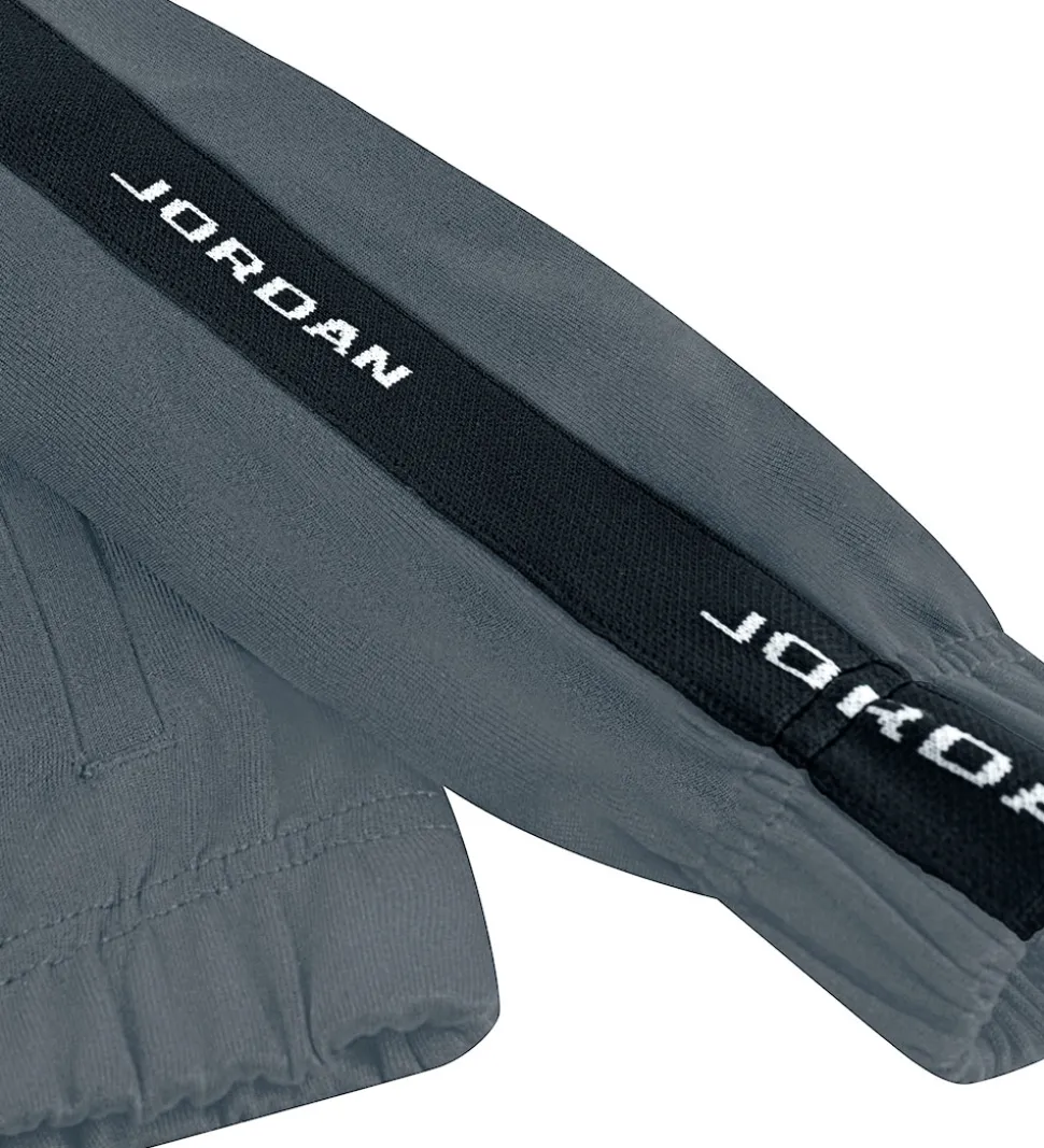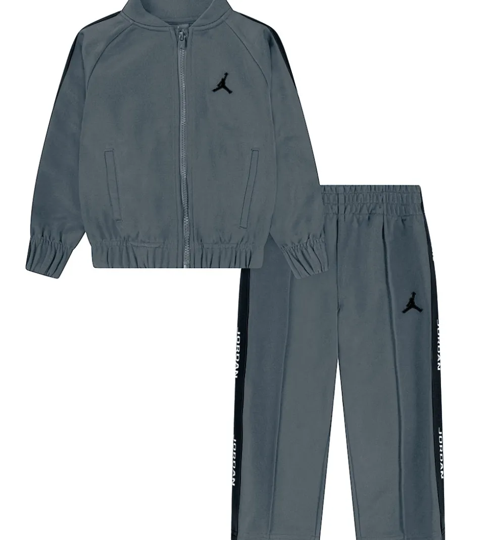 Flot Jordan træningssæt, der består af en cardigan og et par træningsbukser i grå i en glatvævet kvalitet og med sorte logostriber ned ad ærmerne og buksebenene.