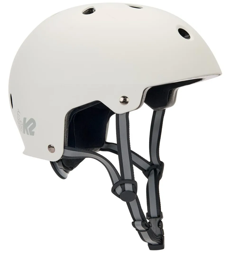 Smart K2 hjelm i lysegrå med et mærke med “K2 Varsity” bagtil på højre side og “K2” fortil på venstre side.