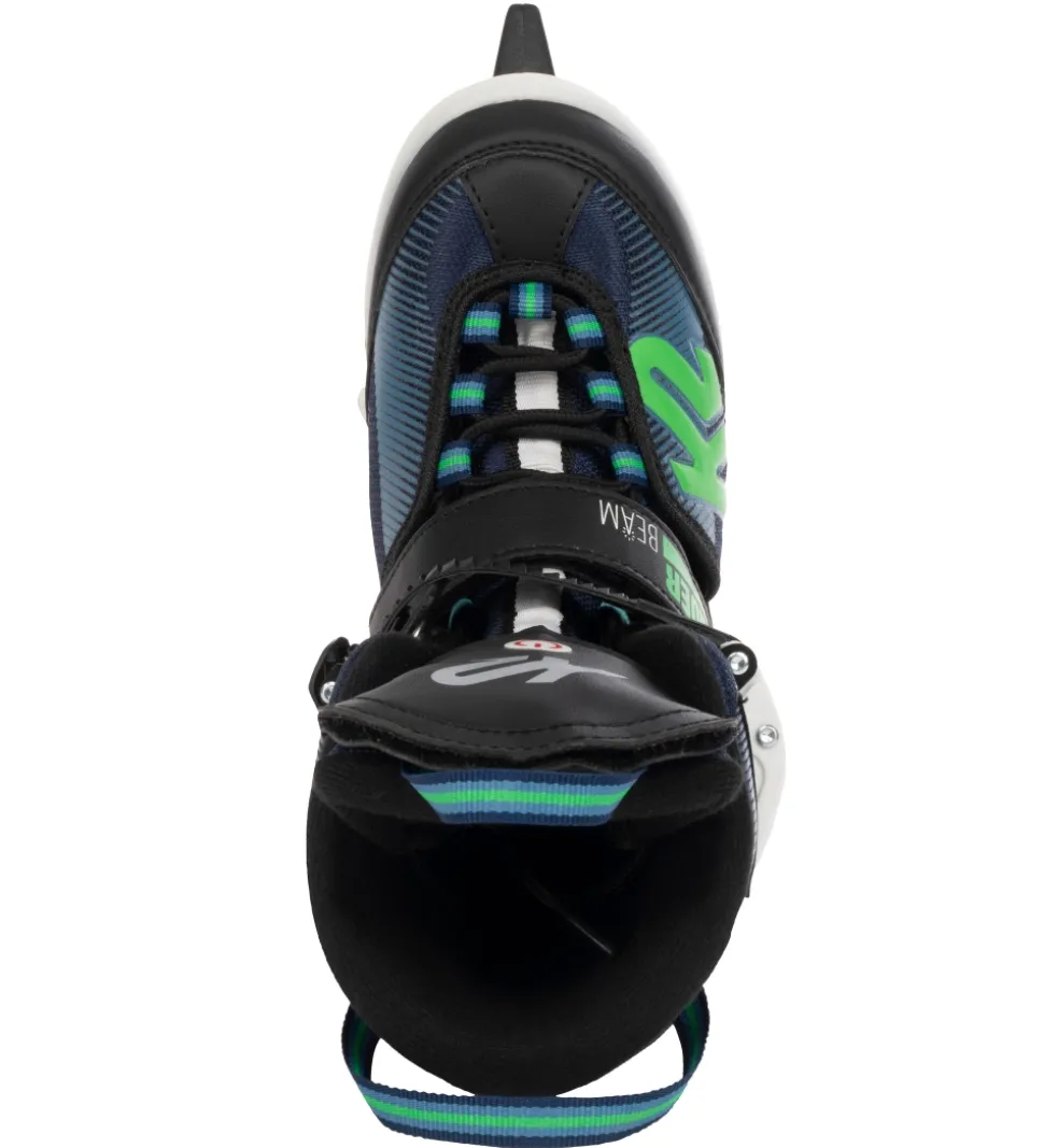 Flotte K2 skøjter i sort og mørkeblå nuancer med grønne og hvide detaljer og logoer. Der er sejt, blåt lys med tre indstillinger i snuden, som tændes og slukkes ved hjælp af en knap på pløsen.