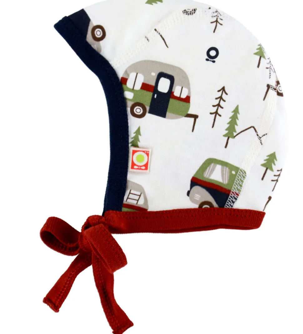 Charmerende Katvig babyhjelm i hvid med campingprint. Babyhjelmen har en rund hovedform med en navyblå og en rød stribe langs kanten. Den bindes under hagen med bindebånd.