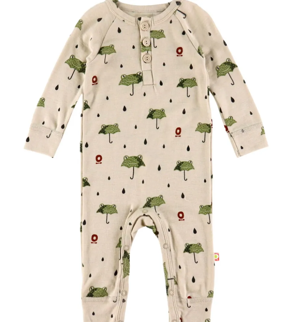 Charmerende Katvig heldragt i en lys beige nuance med et sødt, grønt print af frø-paraplyer og sorte dråber. Heldragten har en rund halsudsklæring og tre knapper foran. Den har lange lærmer og lange ben med brede kanter. Den lukkes mellem benene med trykknapper. Heldragten er fremstillet af økologisk merinould.