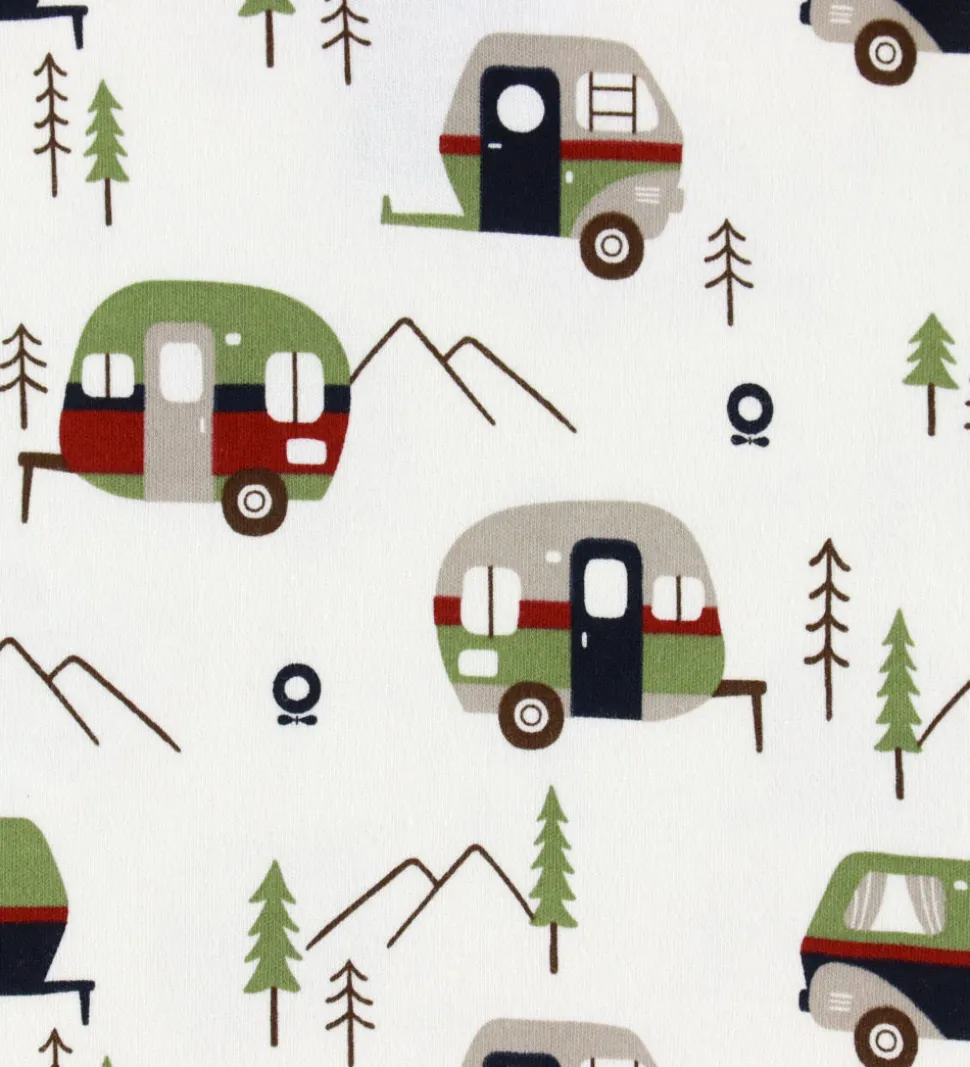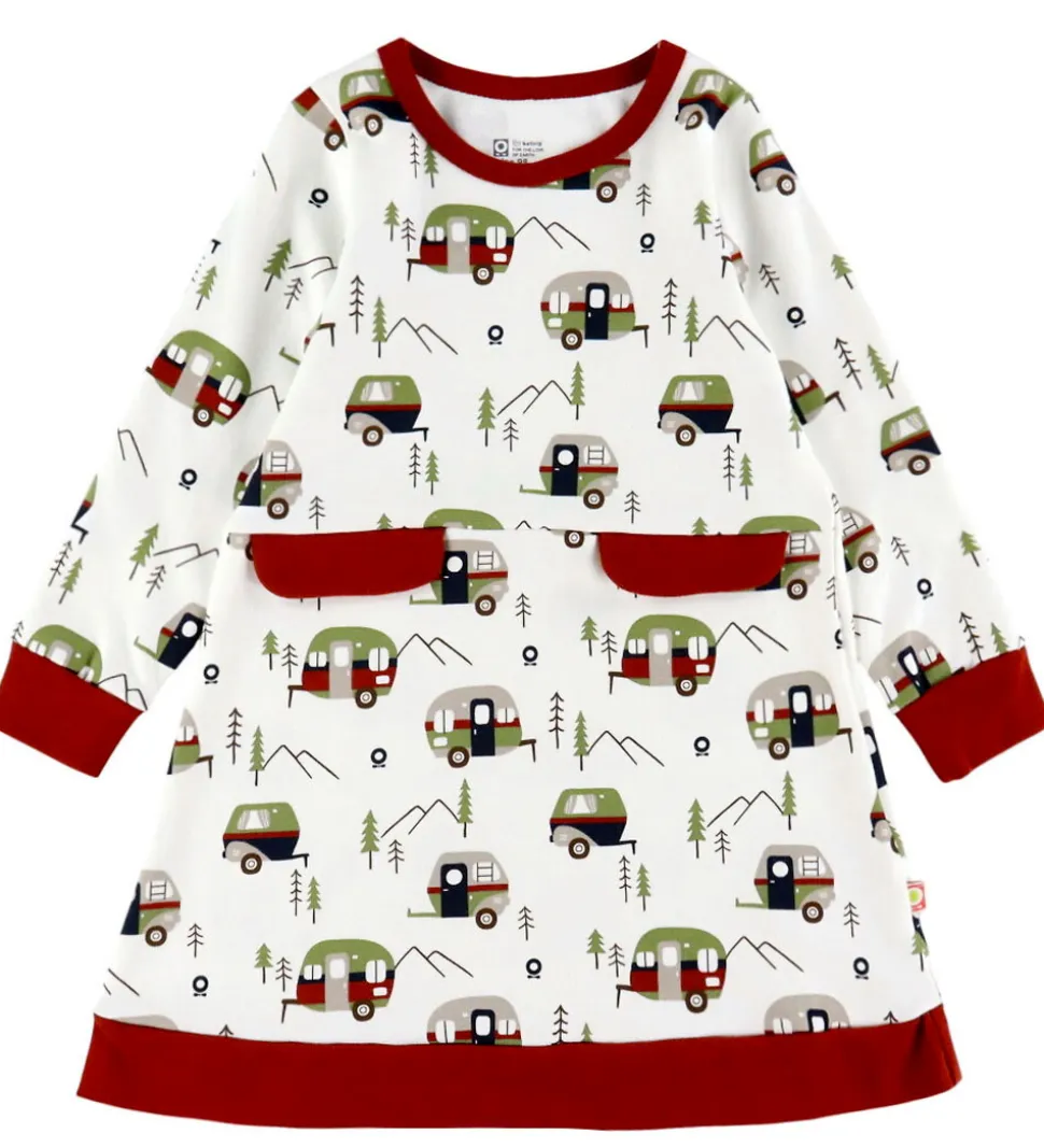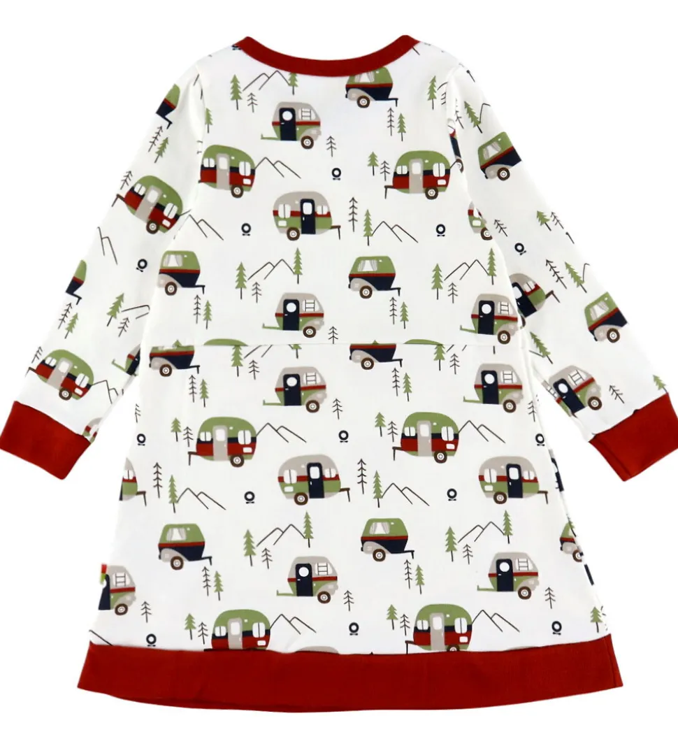 Fin Katvig kjole i hvid med campingprint og røde kanter. Kjolen har en rund halsudskæring og lange ærmer med brede ribkanter. Den har en ribkant i bunden og fortil er der to røde flapper, som ligner lommer.
