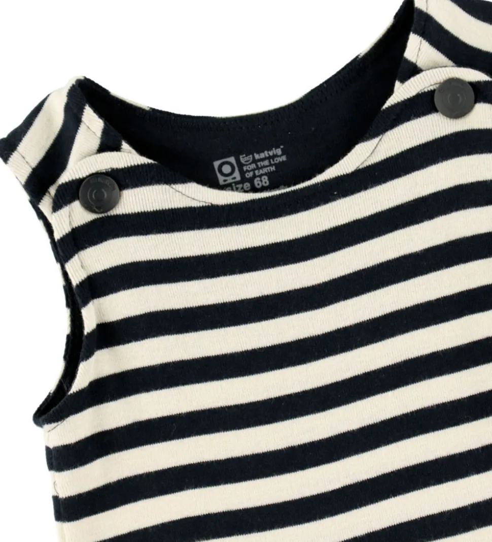 Fin Katvig sparkedragt med vandrette striber i navyblå og hvid. Foran er der to praktiske lommer med en rød kant øverst. Katvig sparkedragten har brede skulderstropper, som sættes fast foran med trykknapper. Den har lange ben med trykknapper mellem benene.