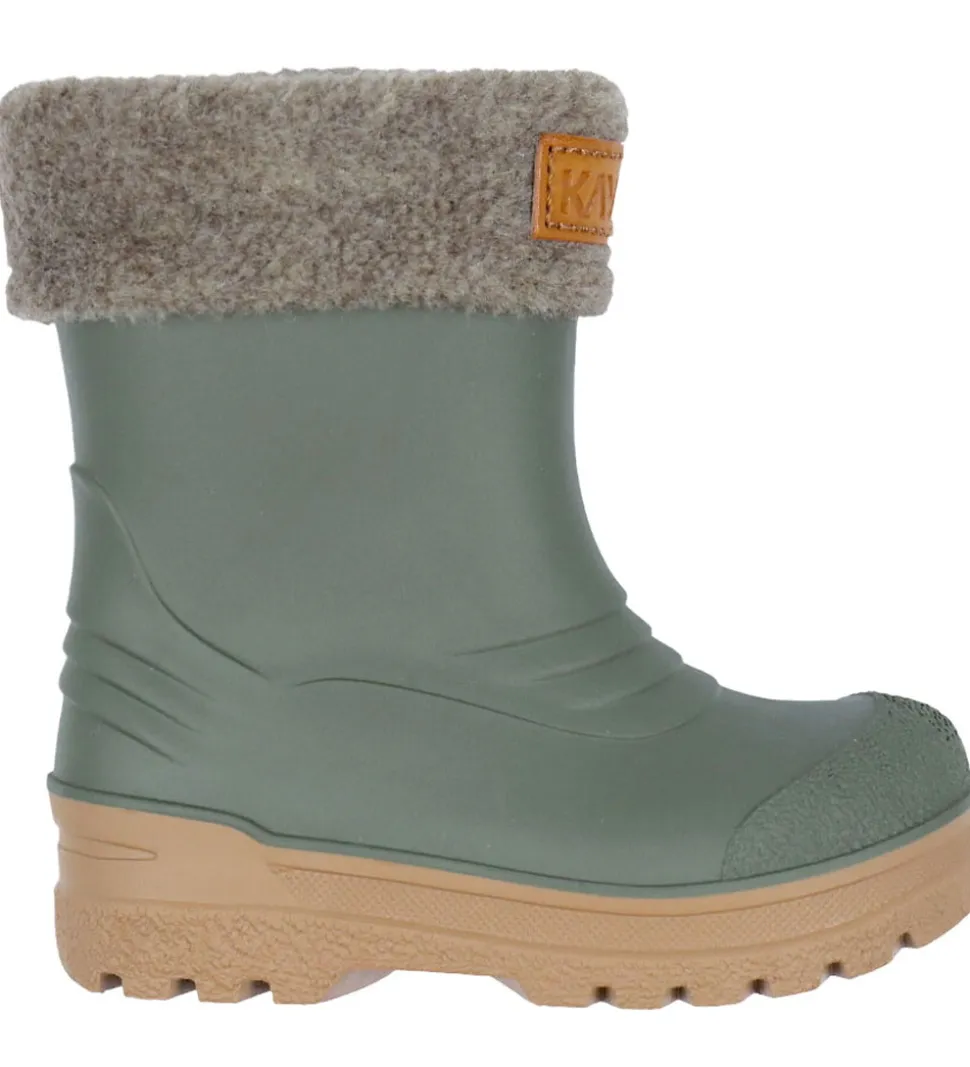 Lækre Kavat gummistøvler i mørkegrøn med en brun kant af uld i toppen og med brune ydersåler.