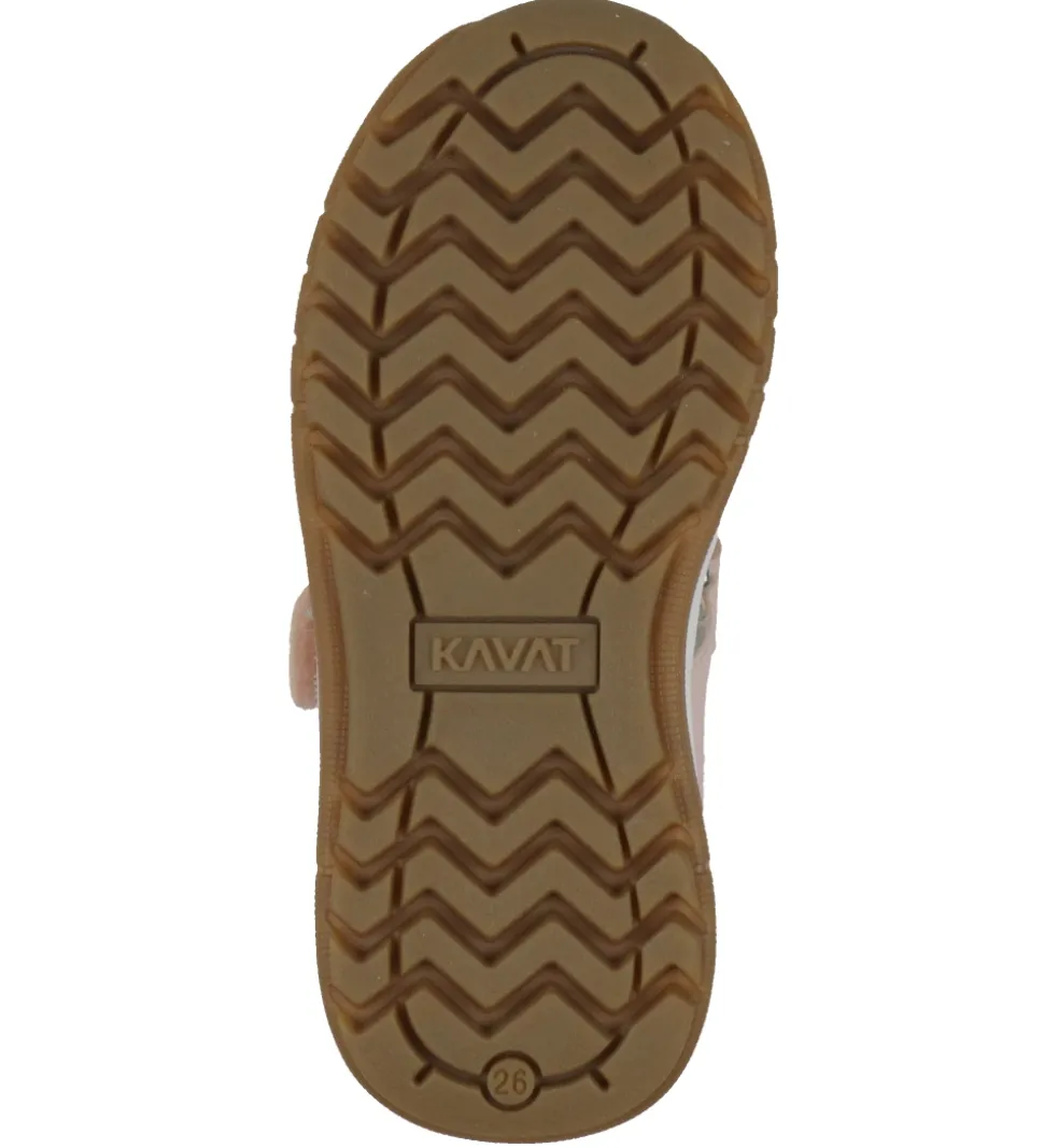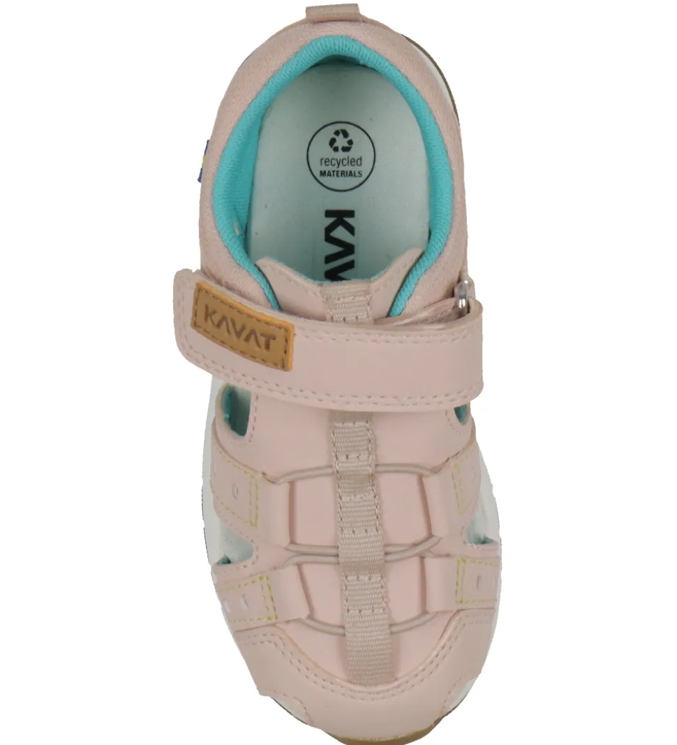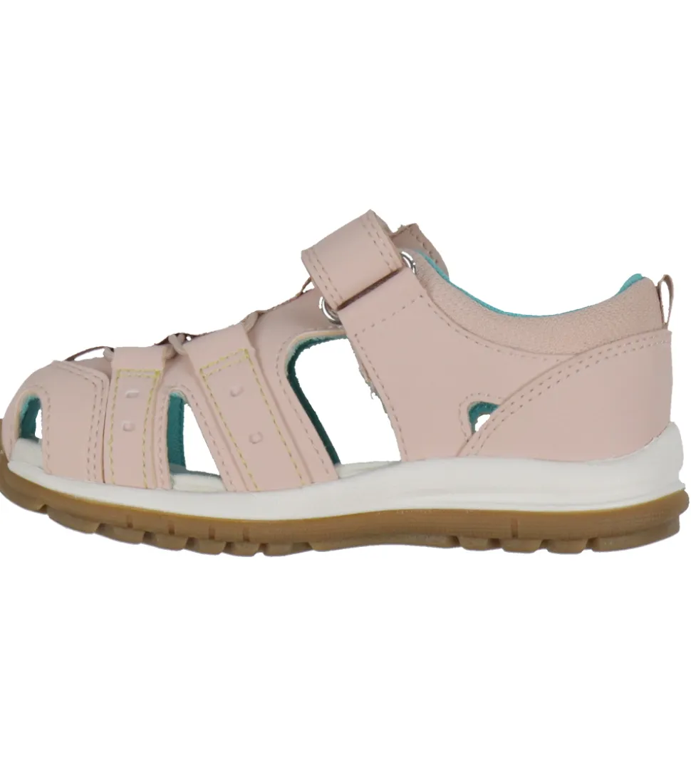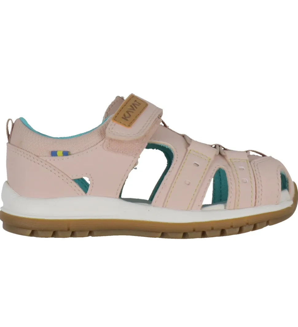 Fine Kavat sandaler i lys rosa med ydersåler i hvid og brun. Indvendigt er der tekstil i turkisblå.
