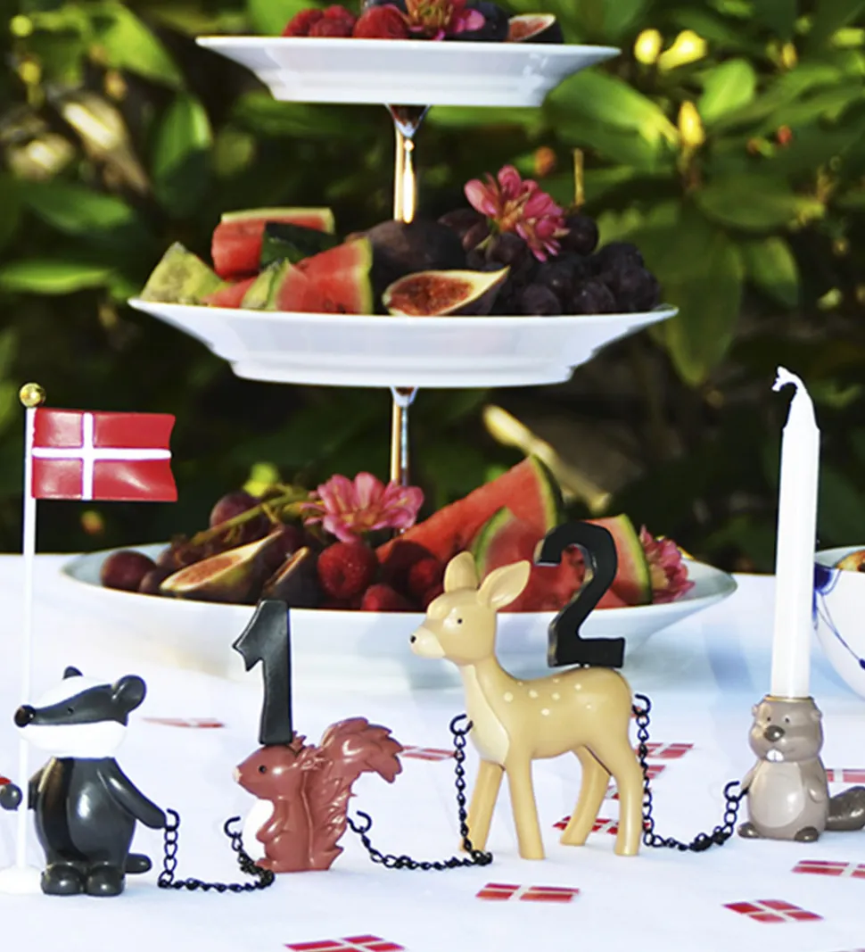 Fødselsdagstogets har plads til to stearinlys i bæveren og ræven, mens tallene skal placeres i egernet og hjorten og flaget i grævlingens ene arm.