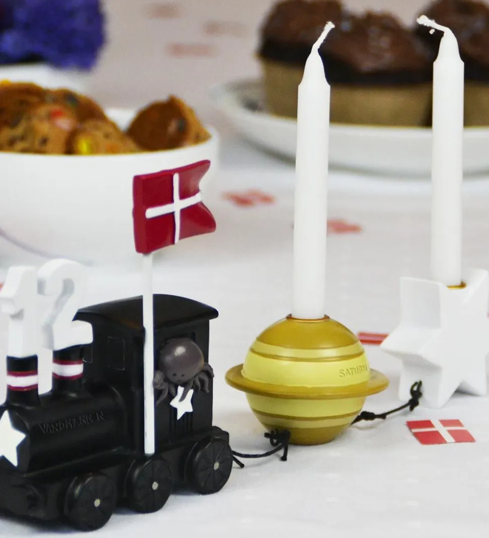 Fødselsdagstogets har plads til to stearinlys i stjernen og planeten, imens tallene og flaget skal placeres på selve fødselsdagstoget.