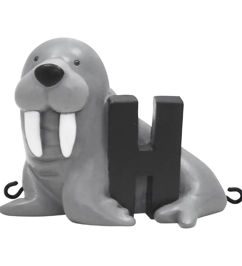 Skøn Kids by Friis Hvalros i grå med kæmpe stødtænder. Hvalrosen sidder med og krammer rundt om blokbogstavet H, som er malet i sort.