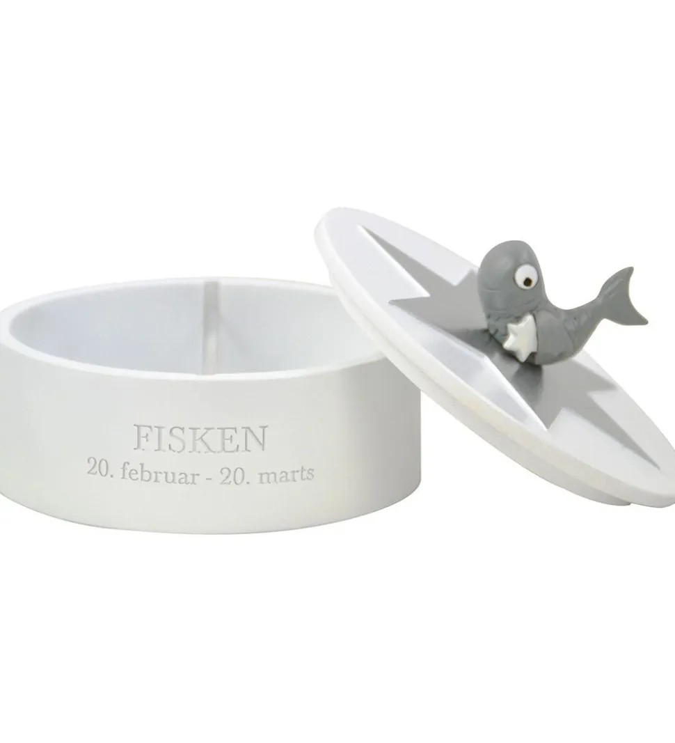 Flot Kids by Friis smykkeskrin i hvid med stjernetegnet Fisken. Ovenpå sidder en en sød figur, som skal illustrere stjernetegnet, og figuren holder en stjerne, der lyser i mørke. Fortil står der skrevet “FISKEN” og stjernetegnets periode.