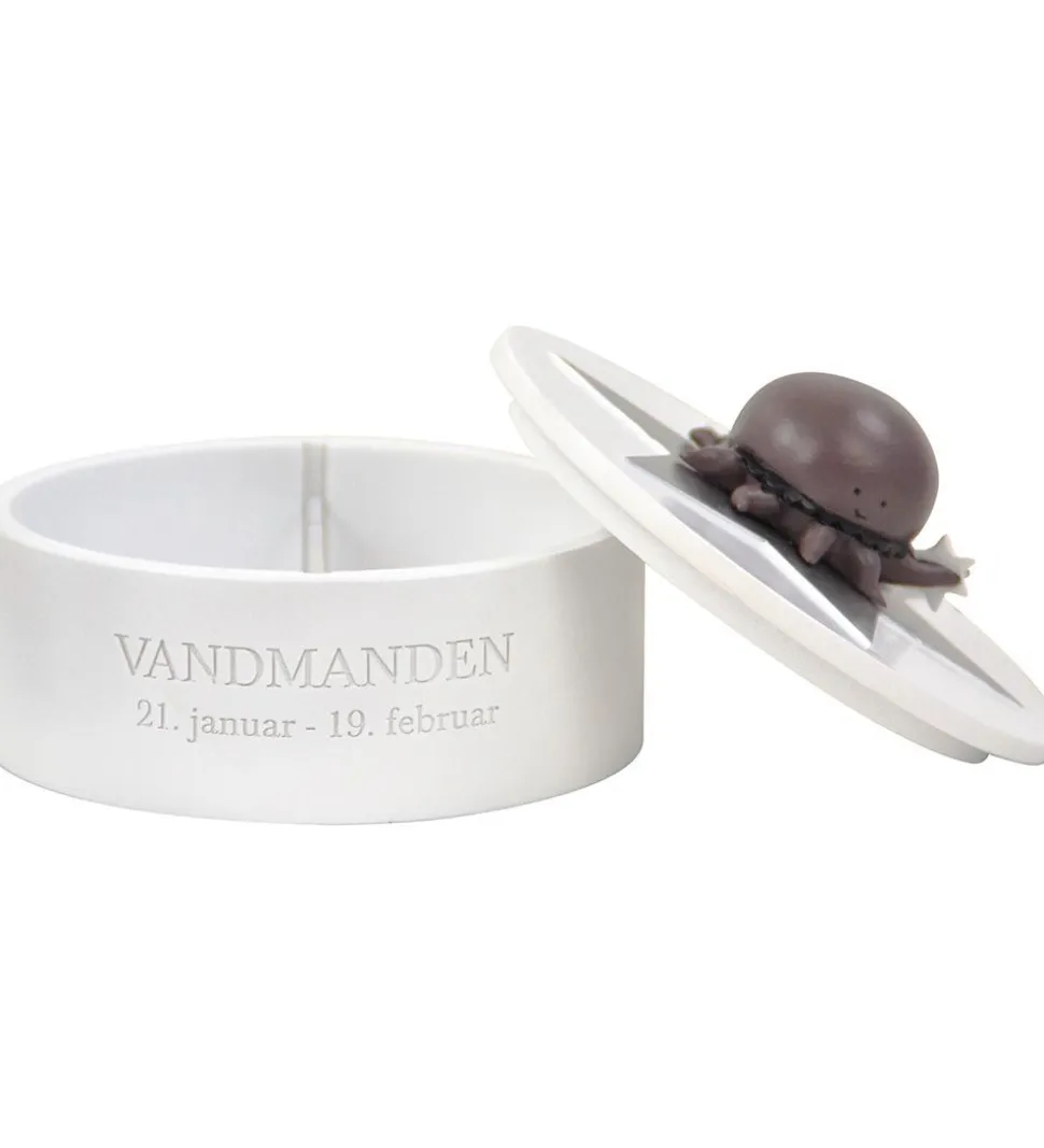 Flot Kids by Friis smykkeskrin i hvid med stjernetegnet Vandmanden. Ovenpå sidder en en sød figur, som skal illustrere stjernetegnet, og figuren holder en stjerne, der lyser i mørke. Fortil står der skrevet “VANDMANDEN” og stjernetegnets periode.